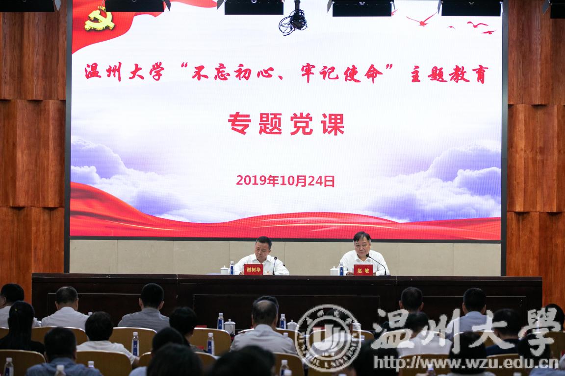 为深入开展“不忘初心、牢记使命”主题教育,坚持用习近平新时代中国特色社会主义思想指导实践,根据校党委部署,10月24日下午,校党委书记谢树华带头上主题教育专题党课,校领导班子成员、全校中层干部参加。省委主题教育第十五巡回指导组组长刘剑虹,成员余键、吴南丰莅临指导。专题党课由校长、党委副书记赵敏主持。