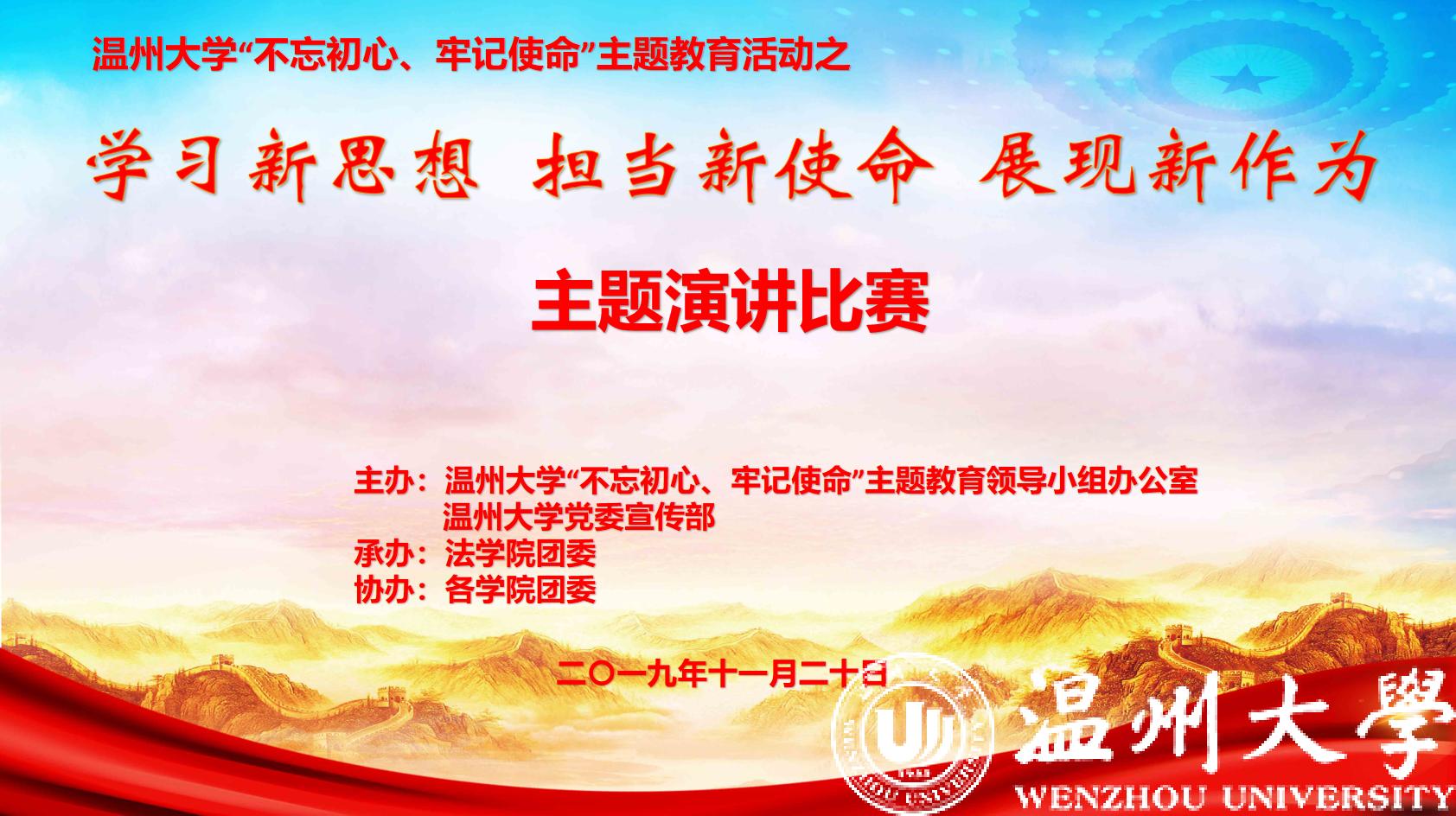 “革命时代的中国青年,他们用热血、用汗水铺就了如今这盛世。他们是最不忘初心的人们,也是我们新时代青年学子求学路上的历史坐标......”11月20日下午,由校党委“不忘初心、牢记使命”主题教育领导小组办公室、党委宣传部主办,法学院团委承办、各学院团委协办的香蕉视频 “不忘初心、牢记使命”主题教育之“学习新思想、担当新使命、展现新作为”主题演讲赛在南校区教育学院报告厅举行。校党委宣传部、学生处、国际教育学院、校团委、人事处相关负责人出席并担任比赛评委。各学院学生党员与入党积极分子代表观看了比赛。