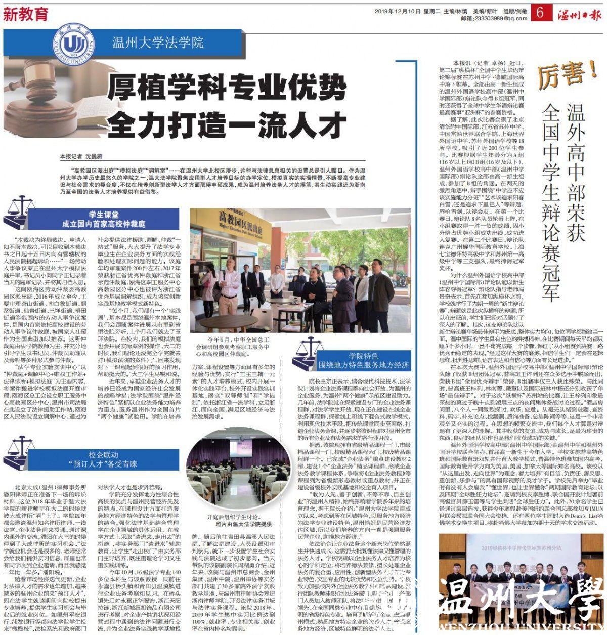“每个月,我们都有一个‘实践周’,基本都是围绕温州本地案件,我们会跟随案件进展从市里到省里法院旁听,上个月我们就去了玉环法院。在校内,我们的模拟法庭也会开展实际案例的操作,大二的时候,我们理论还没完全学完就去打(模拟法院的案件)了,回来发现对下一课程起到很好的预习作用,帮助挺大的。”大三学生马锐和说。