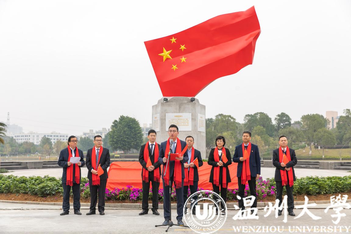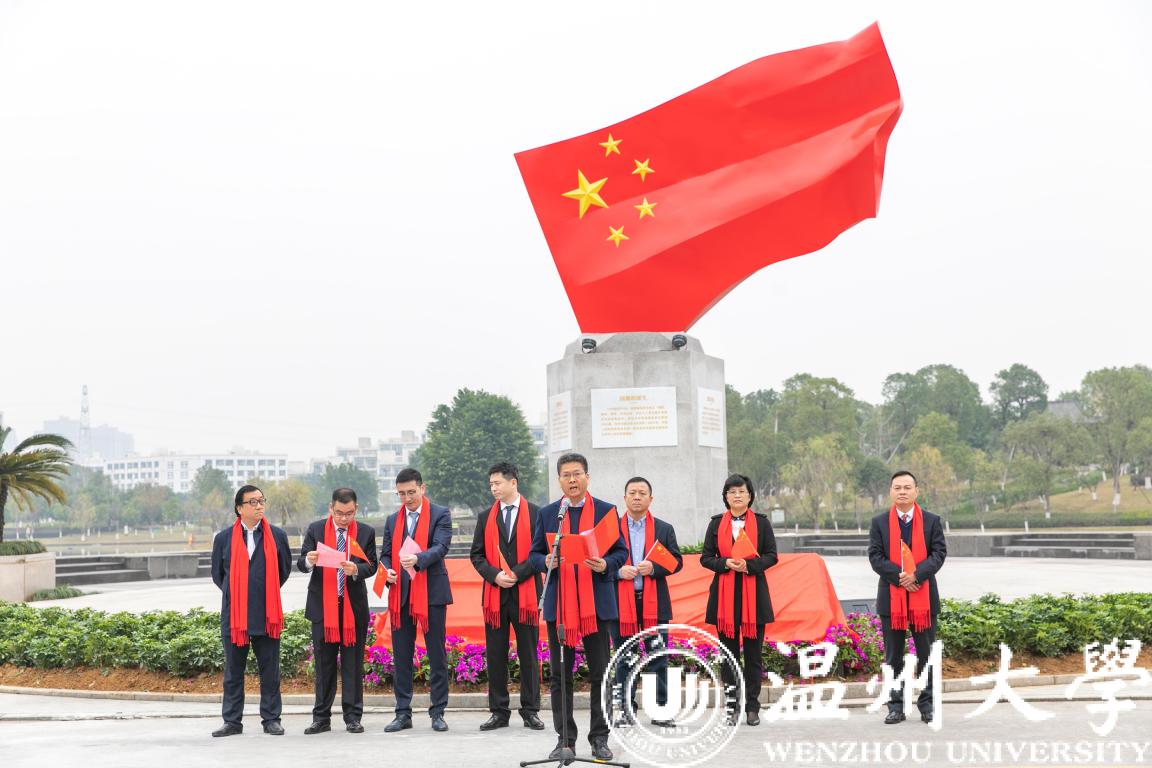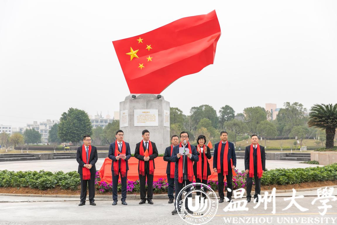 12月30日上午,香蕉视频 国旗广场落成揭牌仪式在明心湖畔举行,这是国内高校首个国旗教育主题广场。温州市委宣传部常务副部长邱小侠、华峰集团董事长尤飞宇、副总裁尤飞锋、副总经理邹宗钧,校领导谢树华、庄兴忠、蔡曙光、潘玉驹以及近500名师生代表出席揭牌仪式。揭牌仪式由副校长蔡曙光主持。