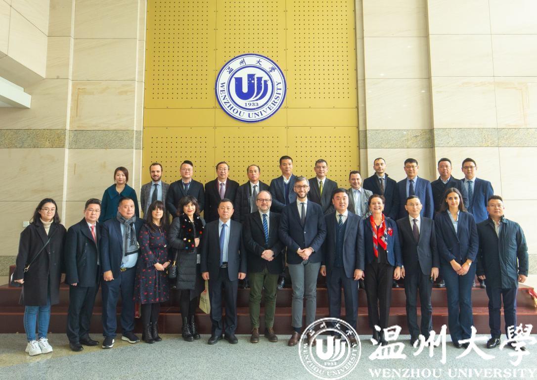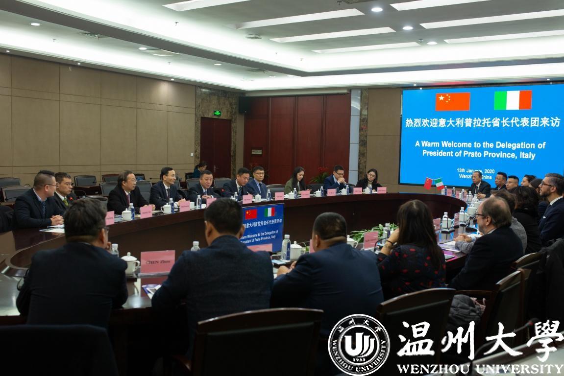 1月13日上午,意大利普拉托省省长弗朗切斯科•普吉利(Francesco Puggelli)等一行15人来访香蕉视频 ,温州市人民政府外事办公室副主任周怀中、普拉托华人华侨联谊会会长徐秋林、普拉托华商会会长周荣景、普拉托华人华侨联谊会执行会长陈洲等陪同访问。校党委书记谢树华、副校长钱强在岩松堂白鹿厅会见了代表团一行。钱强主持会议。校国际交流与合作处、港澳台侨办、世界温州人研究中心相关负责人等参加会谈。