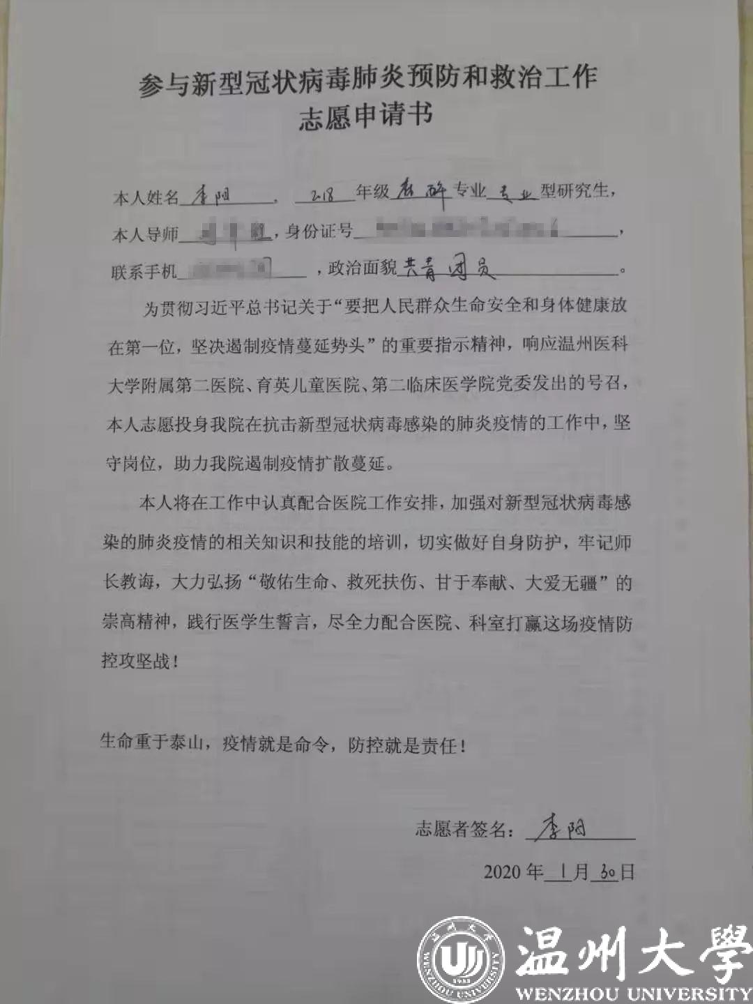受出行管控影响,公交暂停,李阳每天早上七点就要从温医大学院路校区骑自行车到温医大附二医南浦院区,风雨无阻。前几日,根据相关规定,出于对学生的保护,学校暂停了他去临床“疫”线,但是他却“不肯罢休”——通过微信和科室主任申请继续回到临床一线,并发去之前填写的《参与新型冠状病毒肺炎和救助工作志愿申请书》图片,希望能够重返临床学习工作,并说明:“任何风险自己承担。”