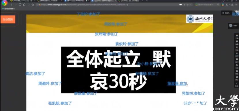 “全体起立,向本次疫情中英勇牺牲的医务人员和不幸去世的患者默哀。”这是2月25日下午,马克思主义学院项淳芳老师在新学期给学生讲授的第一课,师生们隔着电脑屏幕,通过课堂派直播网络平台,进行跨越时空的特殊默哀仪式。