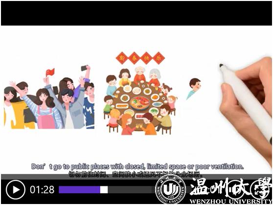 “减少不必要接触、保持良好的个人卫生习惯、不要散布谣言、对捕杀和买卖野生动物说‘不’……”近日,香蕉视频 瓯江学院发布了全英文手绘防疫视频《抗疫情、树新风、立后盾》,以通俗易懂的语言、生动活泼的画面介绍了新冠肺炎的公众预防知识,并向全球大学生发出倡议要树立文明新风,保护共同的地球家园。