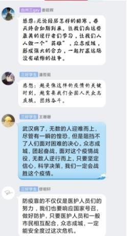 研究生吴倩:疫情大考,见证祖国力量,见证爱国精神。总有一种力量激励我们前行,总有一种精神让我们泪流满面,新型冠状病毒感染的肺炎疫情发生以来,举国上下万众一心,众志成城,共克时艰,战“疫”路上的一个个“好人”,一件件“好事”走进我们的视野,他们的事迹,他们的名字……感动着我们,凝聚起社会正能量,号召着我们必有信心和决心打赢这场疫情防控阻击战。心有大我,一方有难八方支援,全国人民同患难共呼吸,与祖国共命运,各地各部门统一听从党中央的组织和安排,不造谣,不信谣,科学抗击疫情。磨难压不垮、奋起正当时,祖国伟大复兴道路上不是一帆风顺的,但是坚持党的领导,全国人民众志成城,万众一心,人与自然和谐相处,困难总会过去,黎明一定会到来。