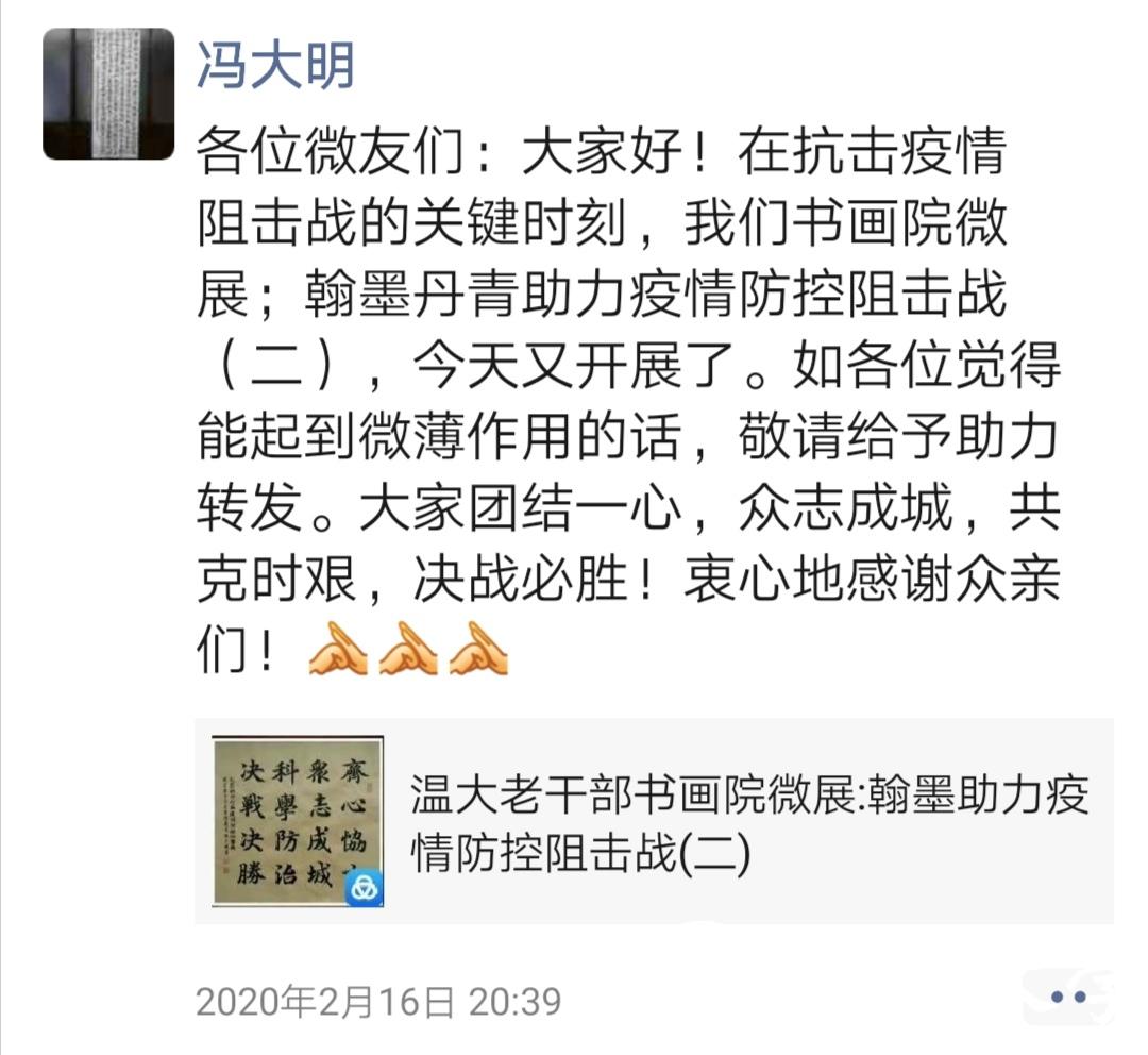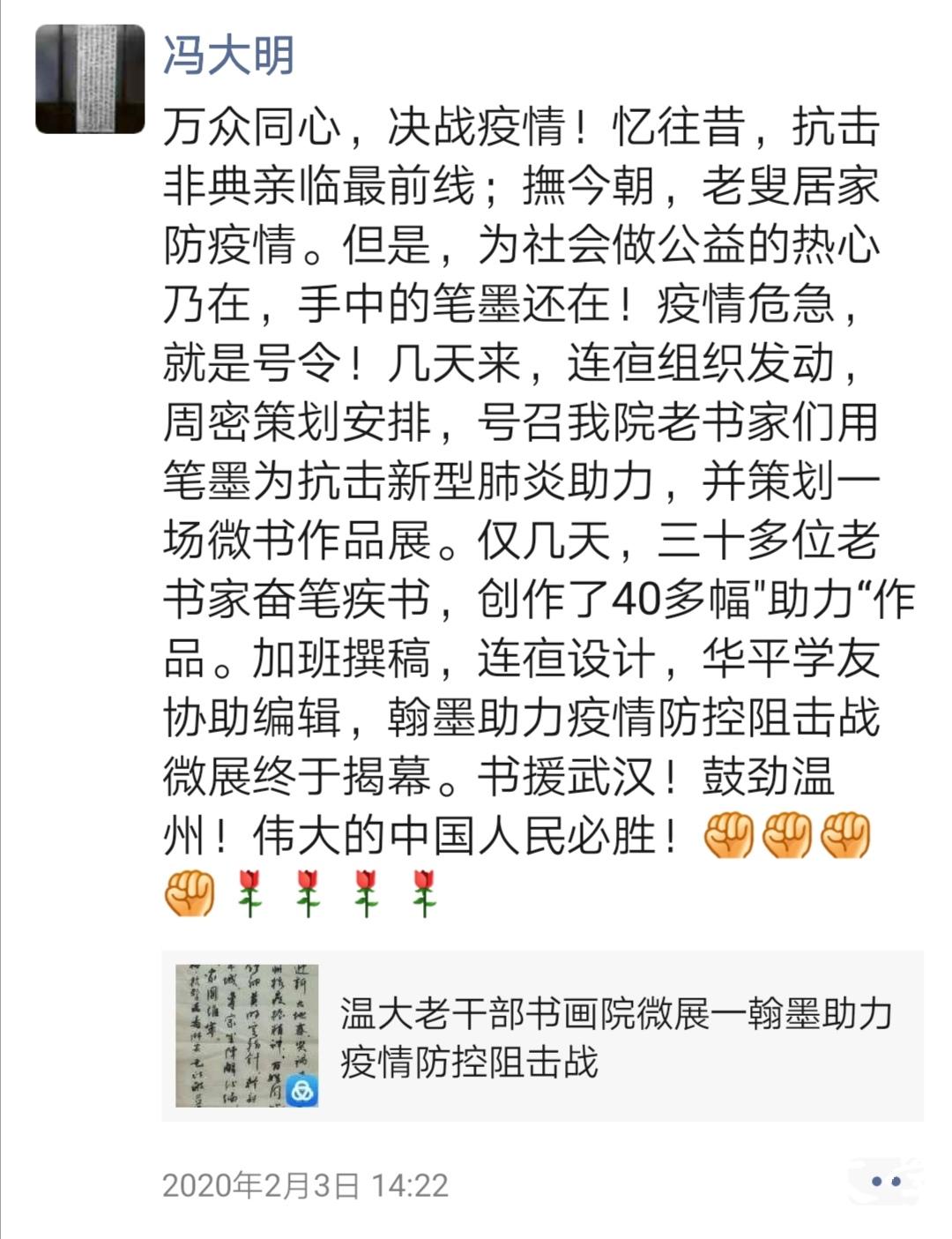 在这个不平凡的开年,一贯坚持“文化公益,服务民众”的香蕉视频 老干部书画院的老书画家们,认真学习习近平总书记有关疫情防控工作的重要讲话,精心策划、积极行动。学校金礼义老书记带头撰文,助力抗击疫情决战决胜。书画院冯大明院长带领大家居家创作,宣传指示精神、讴歌战“疫”英雄、致敬最美逆行者、赞颂人间大爱。他们不顾年老体弱,不分昼夜翰墨丹青,在短短的几天时间里,创作出一百多幅书画作品,其中不少作品还被温州市委老干部局和温州市书法协会的公众号刊发。他们优选七十多幅书画作品,先后两次制作微展,转发宣传,点击量达6000余次。他们的作品鼓舞信心、振奋精神,他们众志成城、为坚决打赢疫情防控阻击战奉献丹心。