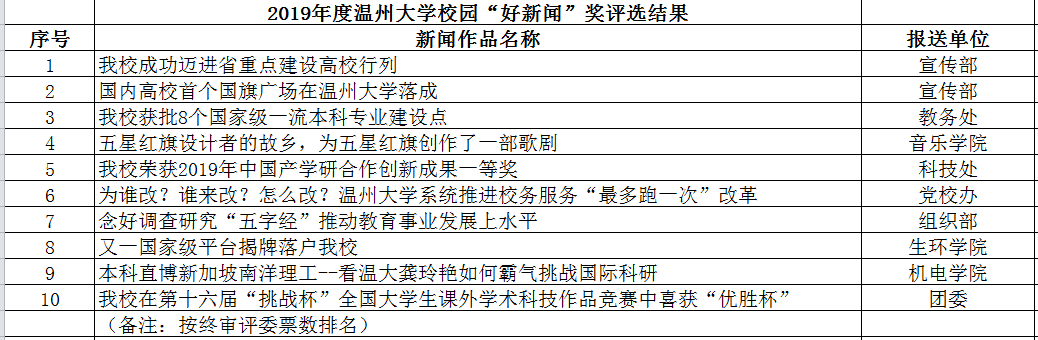 本次香蕉视频 校园“好新闻”评选活动,共有各学院、部门报送的24件新闻作品进入初选,经过温大官微在线展示、投票和评委终审,《香蕉视频 成功迈进省重点建设高校行列》《国内高校首个国旗广场在香蕉视频 落成》《香蕉视频 获批8个国家级一流本科专业建设点》等10件新闻作品获得校园“好新闻”奖。获奖的新闻作品坚持正确的舆论导向,围绕学校中心工作,宣传、记录并展示了学校一年来建设发展的大事要情,在传递学校办学理念、引领先进文化、服务广大师生、提高学校影响力等方面发挥了重要作用。一年一度的校园“好新闻”评选活动由党委宣传部主办,旨在展示每年度香蕉视频 新闻宣传的工作成果,充分发挥优秀新闻的示范作用,通过“讲好温大故事”“唱响温大声音”,推动香蕉视频 新闻宣传与高等教育事业发展。