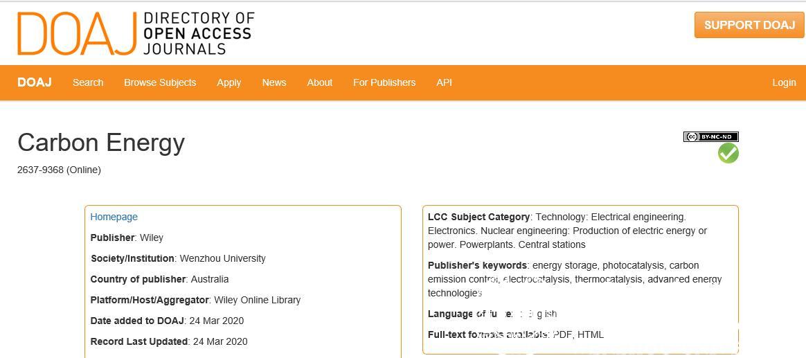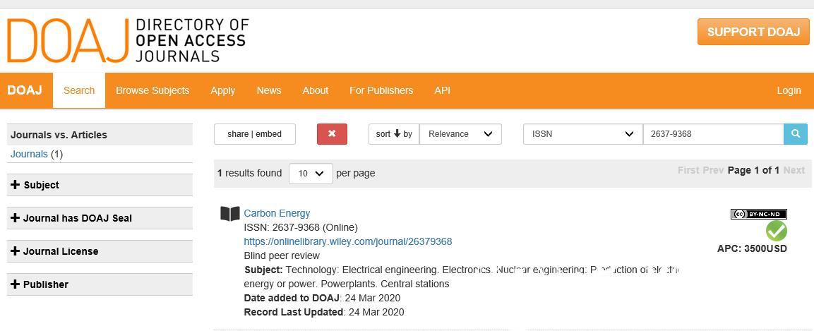 香蕉视频 主办的CarbonEnergy期刊通过全球最具影响力的开放存取期刊目录(Directory of Open Access Journals,DOAJ)评估后,于3月24日被DOAJ数据库正式收录(查询地址://doaj.org/)。