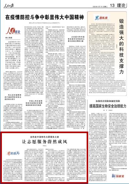 4月7日,《人民日报》刊发香蕉视频 马克思主义学院院长卓高生教授撰写的理论文章《坚持走中国特色志愿服务之路 让志愿服务蔚然成风》。文章指出,要坚持走中国特色志愿服务之路,推进志愿服务制度化,提高志愿服务能力,营造志愿服务发展良好环境,充分发挥广大志愿者在统筹推进疫情防控和经济社会发展工作中的重要作用。现全文转载,以飨读者。
