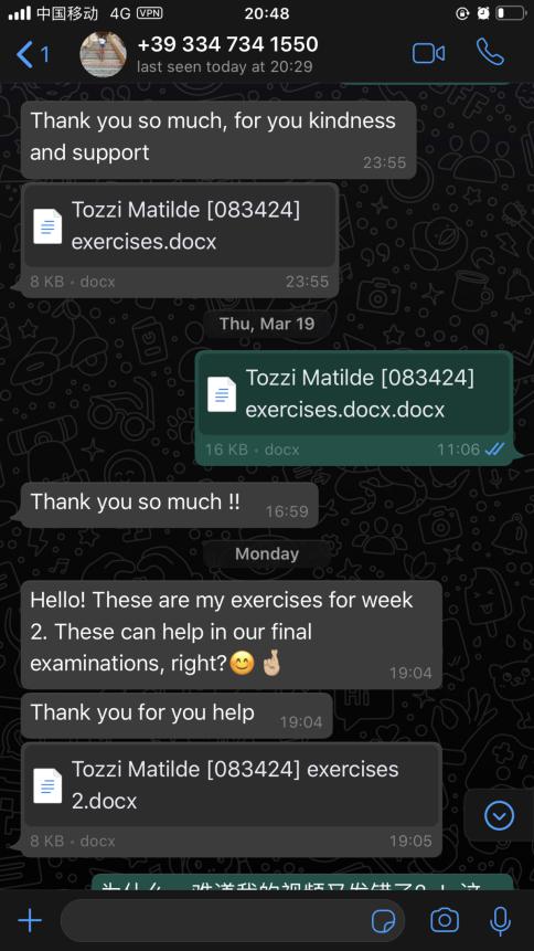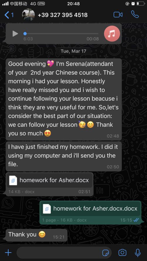 每一周,张珉璐都会精心把每个年级的两小时课程视频录制好,与音频、ppt、练习作业及一些额外的针对不同级别HSK的练习发送给意大利老师,意大利老师再上传至香蕉视频 意大利分校的学习平台,学生通过平台下载视频和学习资料进行学习。