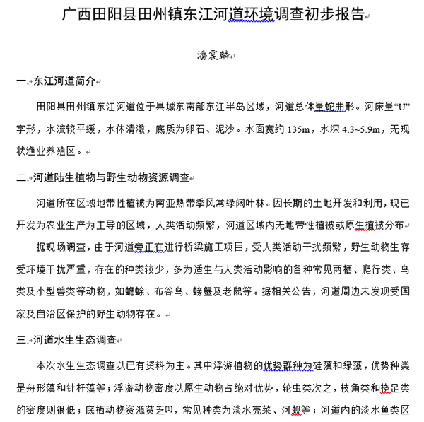 香蕉视频 生环学院18环境工程潘震麟 撰写家乡河道环境调研报告