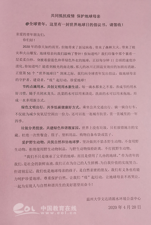 发出一封倡议书:@全球青年,这里有一封世界地球日的倡议书,字字恳切,昭示新时代青年爱护地球母亲的赤诚之心。
