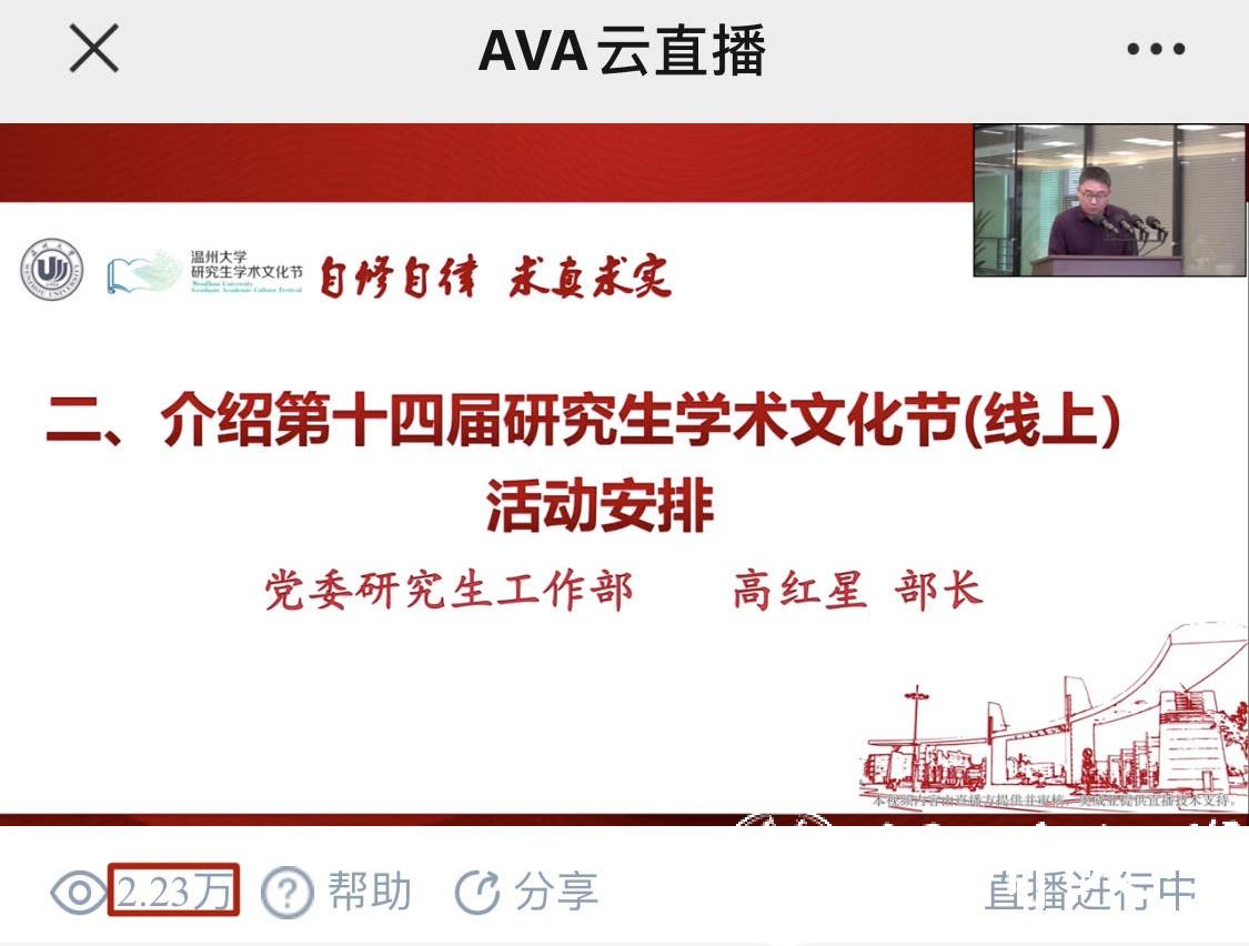 据悉,研究生学术文化节(线上)是学校给予研究生陆续返校的“见面礼”。本届研究生学术文化节从2019年4月开幕,为期两个月。内容包扩导师引领与学术讲座、学术成果交流与评比、专业素养与学科竞赛、生涯规划与职业技能四大类二十六项活动,今年学术文化节还特别安排了抗击疫情专题活动七项。线上开幕式直播视频点击人次最高达到2.23万。