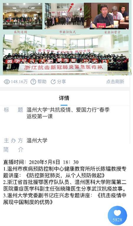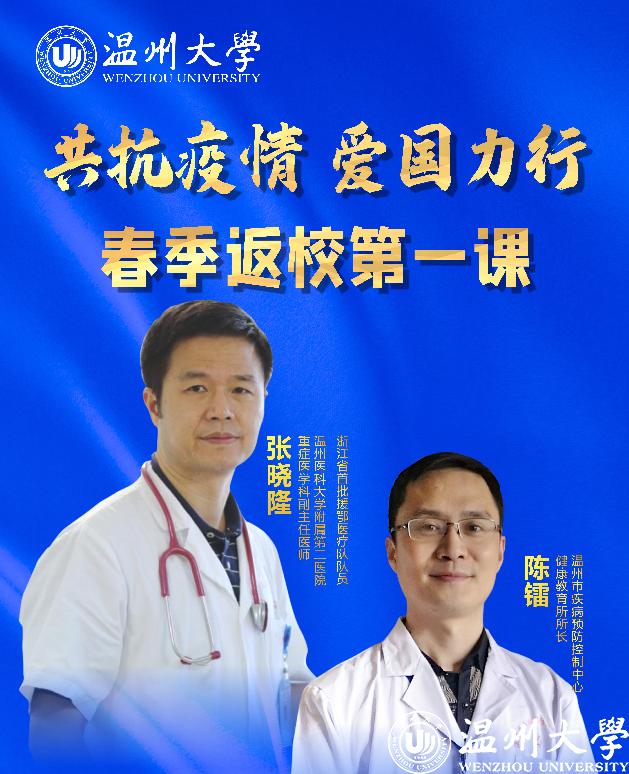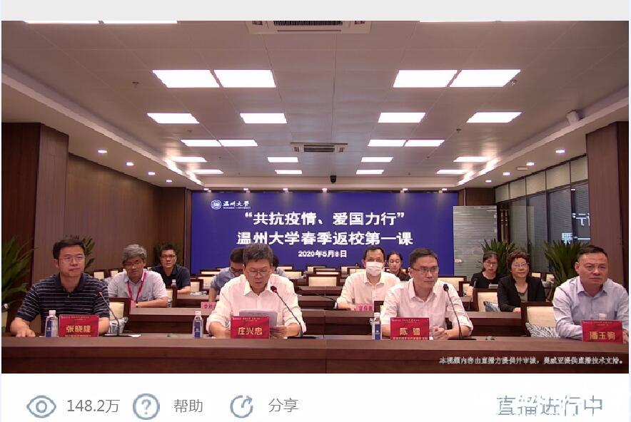 5月8日晚,正当香蕉视频 学生按照“错峰分批”原则陆续返校报到之际,香蕉视频 “共抗疫情、爱国力行”春季返校第一课云端大开讲!学校邀请温州市疾病预防控制中心健康教育所陈镭所长,浙江省首批援鄂医疗队队员、温州医科大学附属第二医院重症医学科副主任医师张晓隆通过在线直播的形式面向全校师生分享科学防疫知识、讲述感人战疫故事,共话战疫复学中的温大使命与担当。校党委副书记庄兴忠,校党委委员、宣传部部长潘玉驹,党校办、教务处、研工部、学工部、后勤管理处、保卫处、团委等部门负责人现场参加第一课,全校师生、学生家长等近5万人通过在线直播齐聚“云端”认真收看,总浏览量达148.2万人次。