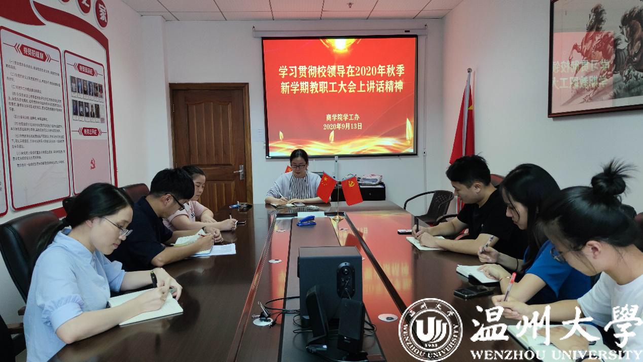 在分会场全程参加了此次会议,聆听了谢树华书记、赵敏校长的讲话。会后,建工学院的辅导员专门召开了学习讨论会。讲话既有对建设一流大学的谋篇布局,又有对学校制度改革的深度思考,也有对师生密切关注问题的直接回应。大家觉得有这样的“四高”感受:一是对取得的成就高度赞扬,学校办学成绩斐然,多项重要指标均列全国非博士点高校前列;二是讲话的内容高屋建瓴,以“锚定1357,奋进2020”的工作主线整体布局;三是让全校教师意气高昂,充分调动了大家的积极性和创造性,在新学期齐心协力、共同努力;四是谋划目标高远催人奋进,努力在建设“重要窗口”、奋力续写温州创新史中展现温大人的担当作为。