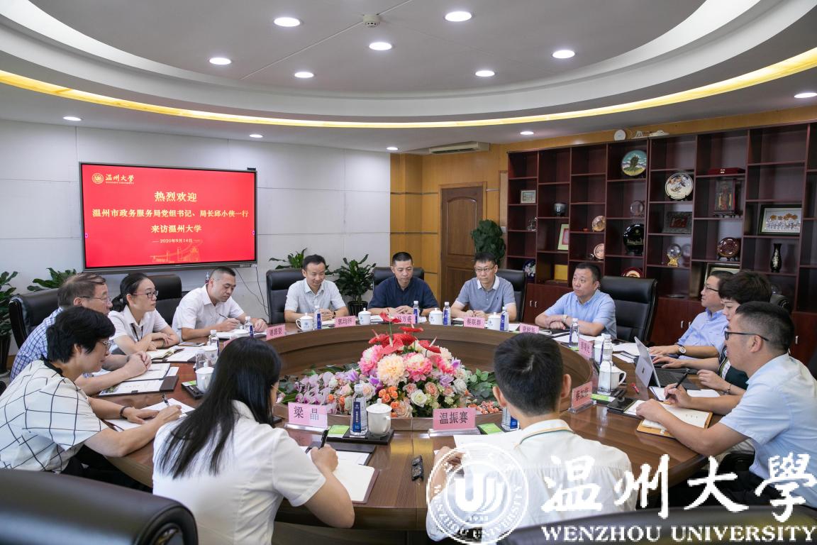 9月17日,温州市政务服务局党组书记、局长邱小侠,副局长詹尔成等一行来访香蕉视频 。校党委书记谢树华,副校长蔡曙光出席接待,相关部门负责人参加座谈。