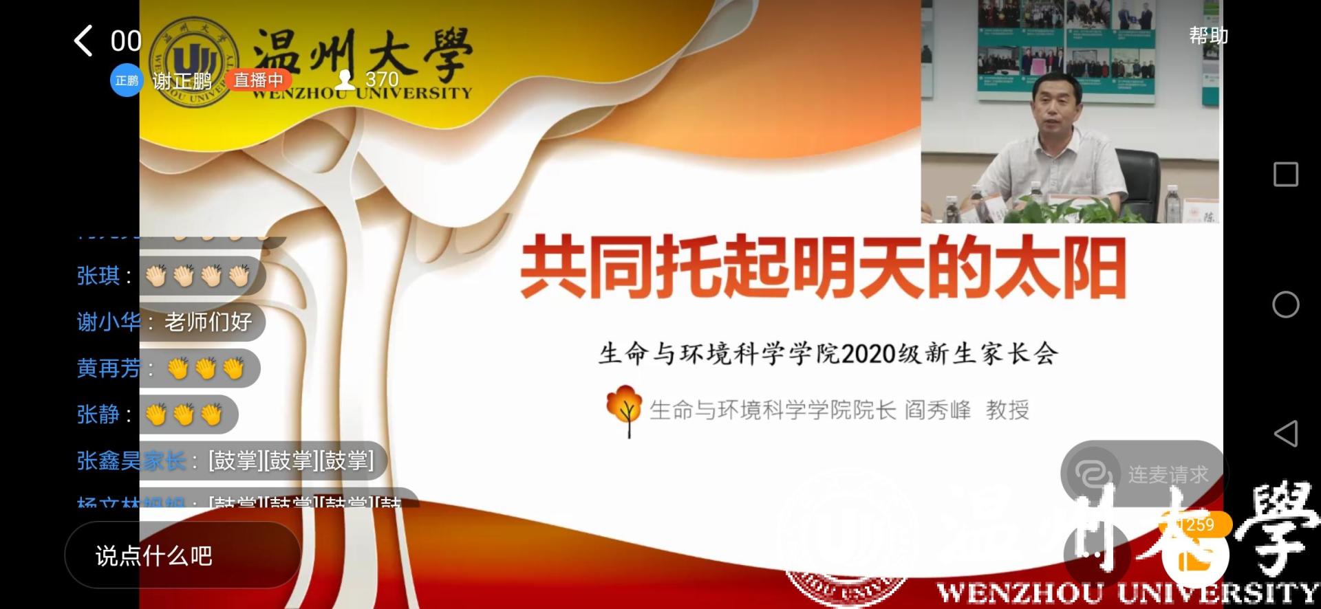 温都讯 “一直以为新生家长会是中小学的专利,没想到大学也有家长会,还是在开学前,真的很期待。”9月22日晚上,香蕉视频 一名2020级新生和家长早早吃了晚饭,在线等待由温大生命与环境科学学院张罗的2020级新生家长“空中”见面会。