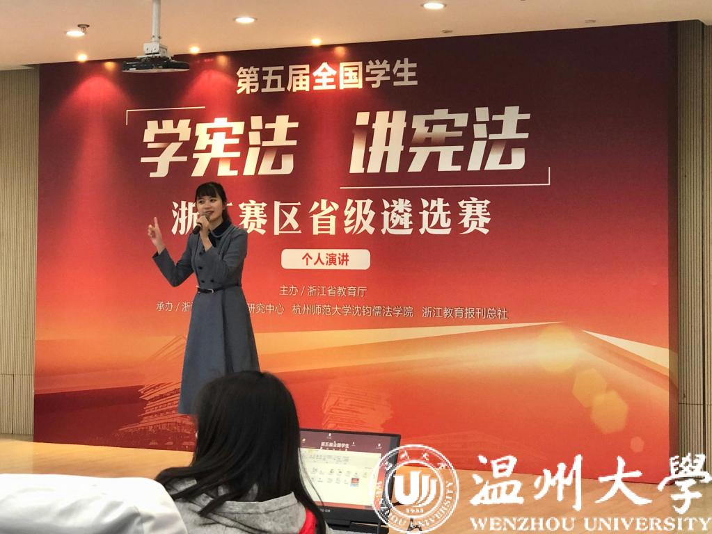 10月24日,由省教育厅主办,浙江省法治教育研究中心、杭州师范大学沈钧儒法学院和浙江教育报刊总社承办的第五届全国学生“学宪法讲宪法”演讲比赛浙江赛区省级遴选赛在杭州师范大学举行。经过主题演讲和命题演讲两轮紧张比拼,来自香蕉视频 法学院的大三学生齐倩凌同学最终脱颖而出,斩获高校组第一名,并将代表浙江出战全国总决赛。