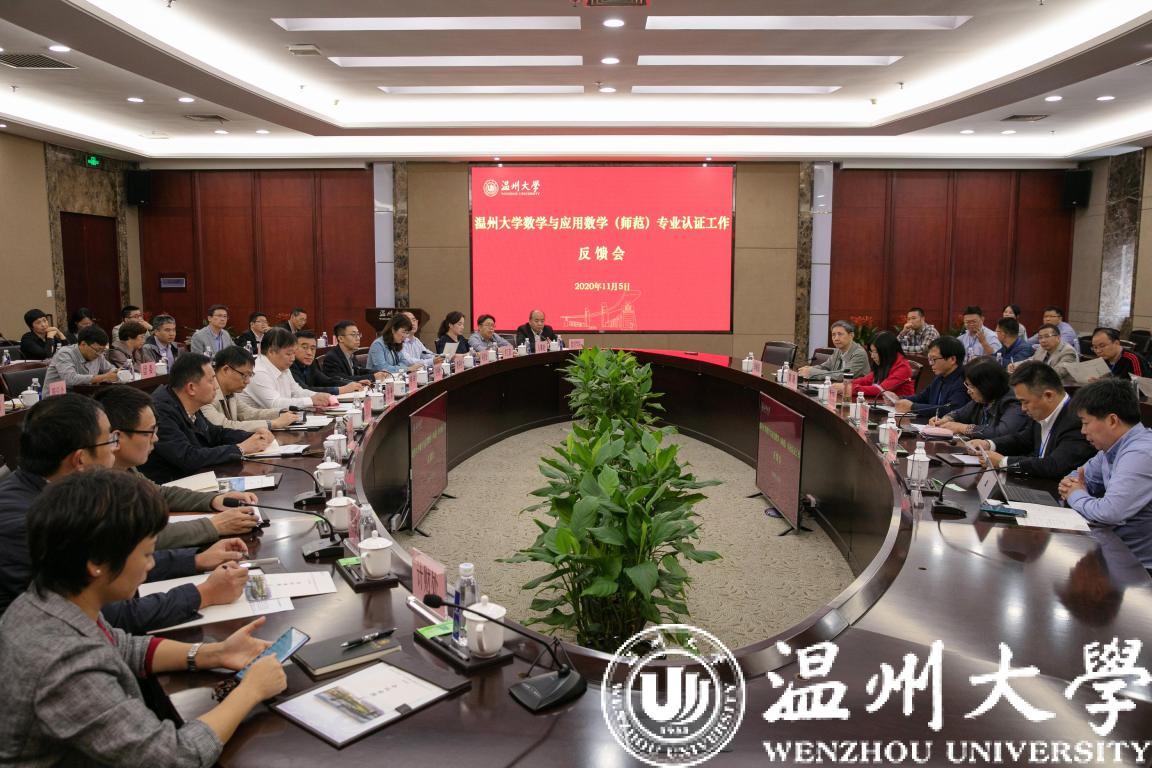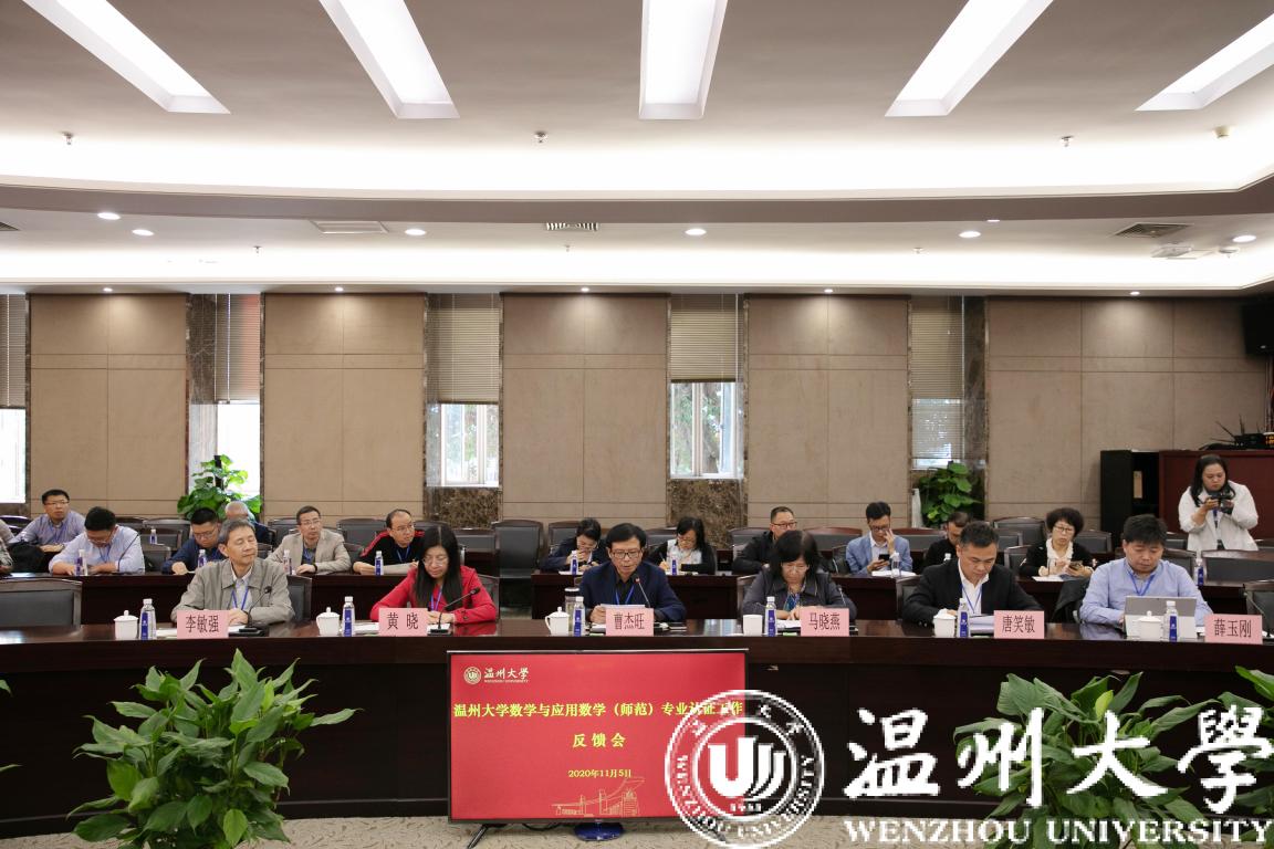 11月5日下午,经过认证专家组3天高强度的现场考查工作,香蕉视频 数学与应用数学专业师范类第二级专业认证专家意见反馈会在岩松堂白鹿厅举行。本次认证由淮南师范学院原校长曹杰旺教授担任专家组组长,组员有泰山学院数学与统计学院院长马晓燕教授、浙江师范大学教师教育学院副院长黄晓教授、湖州师范学院理学院党委书记唐笑敏教授、浙江省教育厅教师工作处原调研员李敏强。浙江省教育考试院项目管理员薛玉刚全程陪同。
