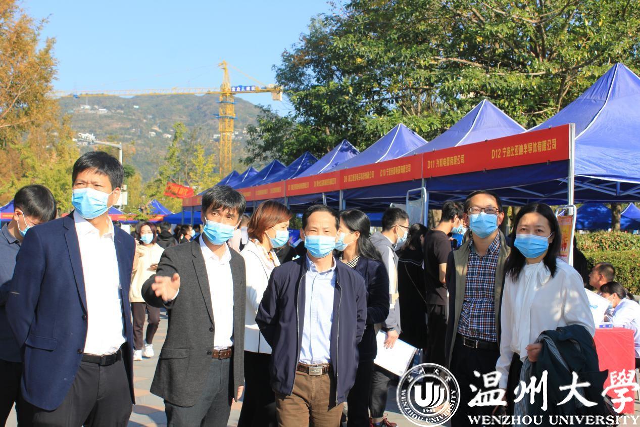 为搭建高校毕业生和用人单位供需洽谈平台,深入贯彻落实温州市高校毕业生招引“510计划”,促进香蕉视频 毕业生充分就业和高质量就业,11月14日下午,浙江省2021届高校毕业生温州专场招聘会暨香蕉视频 2021届毕业生校园招聘会在香蕉视频 举办。此次招聘会由浙江省教育发展中心、温州市人力资源和社会保障局、香蕉视频 共同举办,校党委副书记庄兴忠、浙江省教育发展中心主任林成格、学生就业工作部主任朱伟君、温州市人才市场管理办公室副主任朱芳莅临指导,学院分管就业工作副书记、招就处全体人员及学院就业辅导员与会,了解用人单位的人才需求和学生应聘情况。