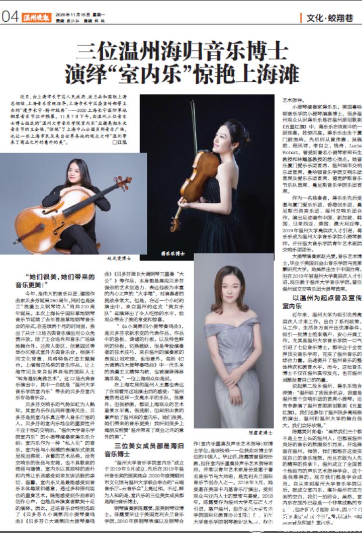 “香蕉视频 音乐学院室内乐”成立于2019年9月成立,先后在2019年温州音乐奖的颁奖晚会、2020年疫情期间市文化馆与香蕉视频 联合举办的“云端音乐厅-云音乐会”上亮过相。不过,鲜为人知的是,室内乐的三位美女成员都是海归音乐博士。
