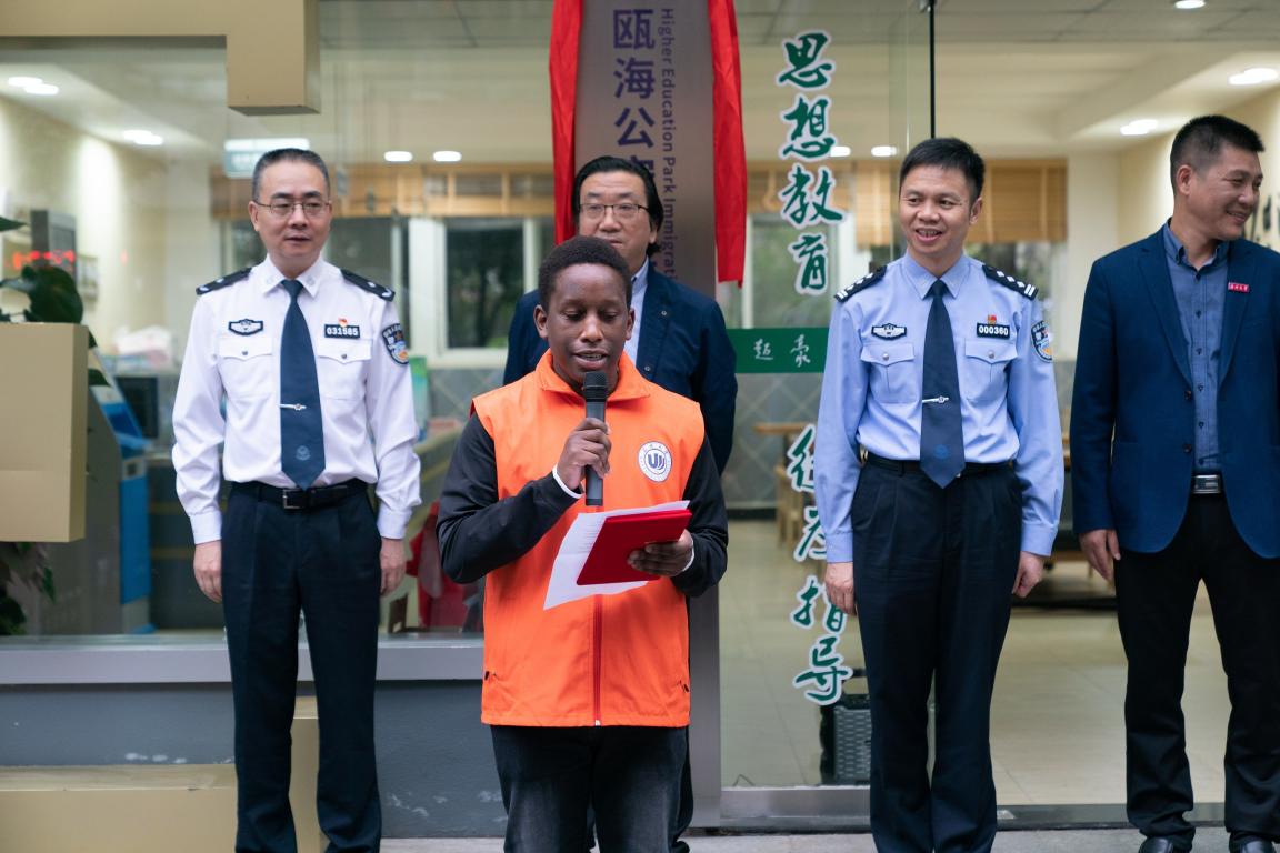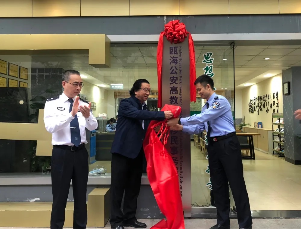 11月20日下午,瓯海公安高教园区移民事务服务站在香蕉视频 正式揭牌成立。香蕉视频 党委委员、副校长蔡曙光,瓯海区副区长、区公安分局局长吴仁伟,温州市公安局出入境管理局局长黄锦化、茶山高教园区派出所所长潘东瓯、香蕉视频 保卫处处长孙安梭、香蕉视频 国际交流与合作处副处长郑婷、香蕉视频 国际教育学院党总支书记林爱菊、副书记方建晓等领导共同参加揭牌仪式。参加揭牌仪式的还有温州市出入境、茶山派出所相关民警,香蕉视频 国际教育学院相关教师,高教园区首批受聘留学生志愿者。仪式由区公安分局党委委员、副局长郑裕军主持。