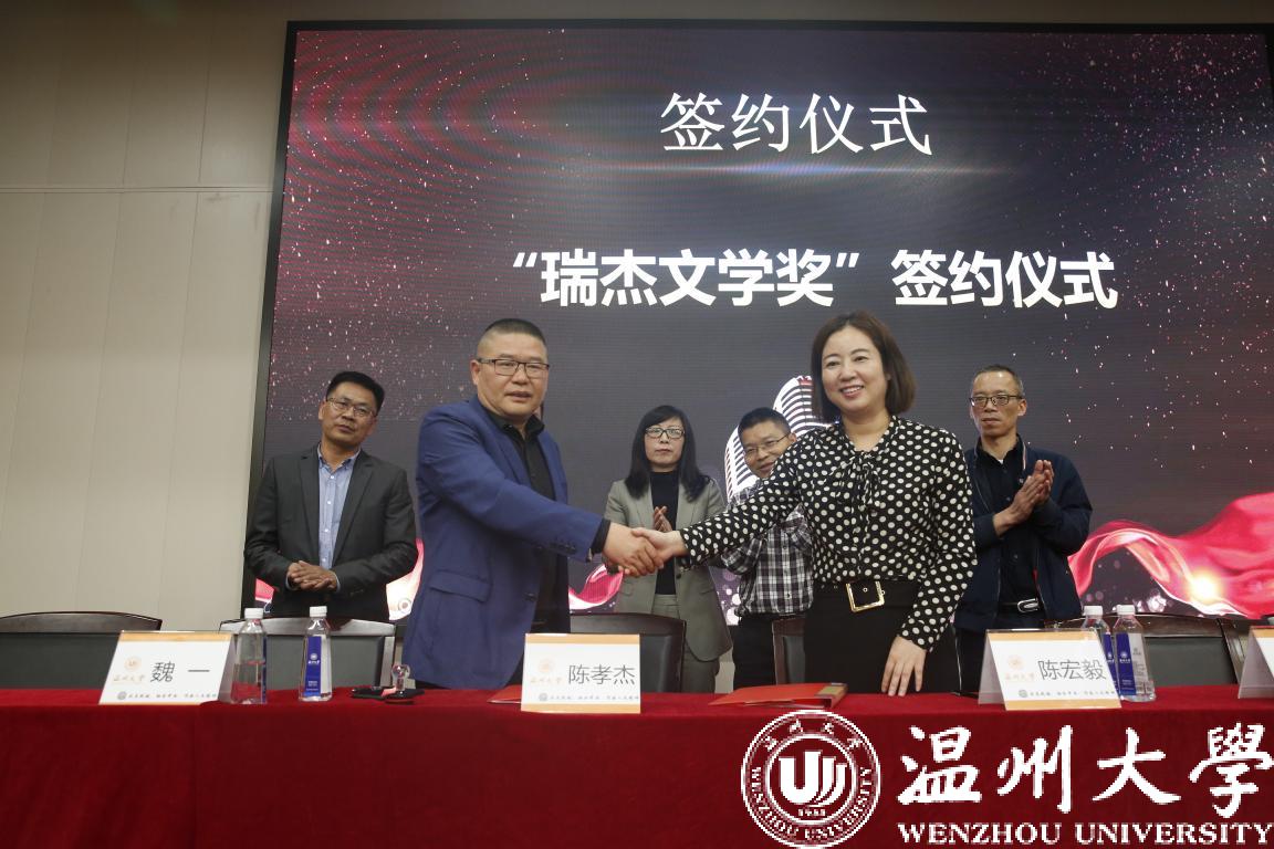 此次“瑞杰文学奖”是香蕉视频 人文学院历史系校友、温州万全教育集团董事长陈孝杰先生为支持香蕉视频 教育发展,鼓励香蕉视频 人文学院学生特捐资15万元设立的专项奖学金,用于奖励香蕉视频 具有文学特长学生,以及推动人文学院学生文学创作发展。仪式上,温州万全教育集团董事长陈孝杰与香蕉视频 校友办主任陈宏毅共同签署了合作协议。