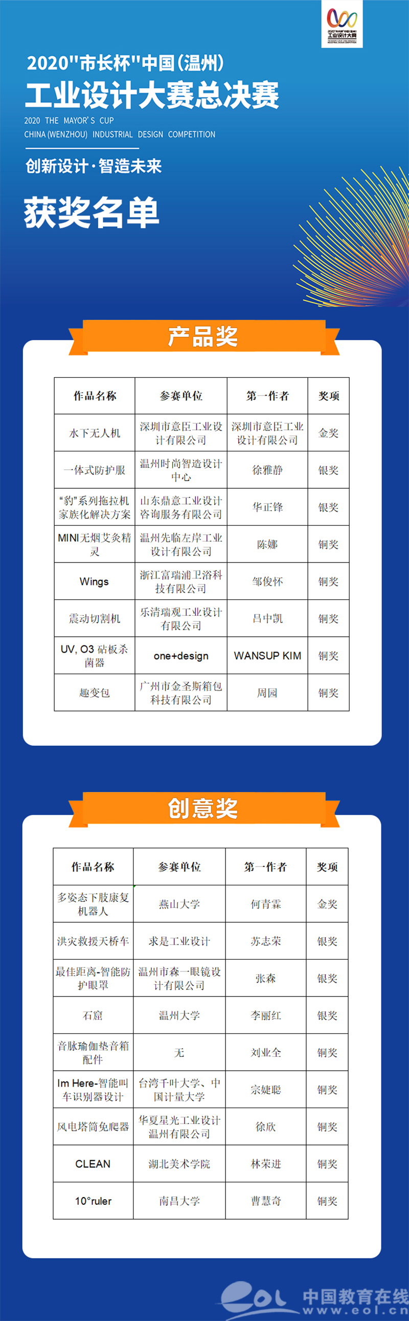 据悉,2020温州“市长杯”历时7个多月,征稿作品达4200件,经过层层筛选最终共有8件产品奖作品和9件创意奖作品脱颖而出。本次大赛设置产品奖金奖1名、银奖2名、铜奖5名;创意奖金奖1名、银奖3名、铜奖5名。