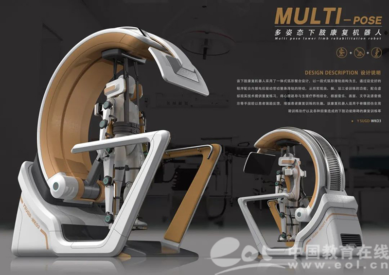 “医院里的CT机是不是既有用又美观?而反观国内外市场上的康复设备设计比较简单,且大多是针对单一姿态、单一关节的训练。我们的设计产品最大的亮点就是能够实现坐、躺、站的三姿训练。”