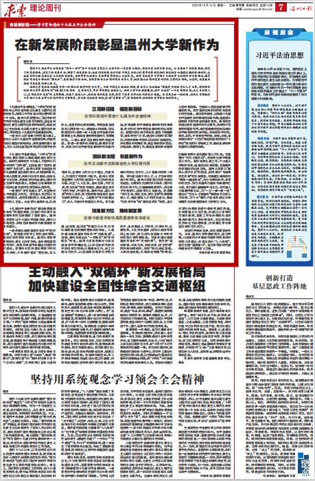 【编者按】12月14日,温州日报求索栏目全文刊发香蕉视频 党委书记谢树华的理论文章《在新发展阶段彰显香蕉视频 新作为》。文章认为,党的十九届五中全会是处在“两个一百年”奋斗目标历史交汇点上召开的一次具有全局性、历史性意义的重要会议。当前及今后一段时间,香蕉视频 要把学习贯彻十九届五中全会精神作为重要任务,努力在建设教育强国、打造“重要窗口”、续写新时代温州创新史中彰显新的作为。文章强调,香蕉视频 要立足新征程、锚定新目标,在学深悟透中贯彻十九届五中全会精神;回应新主题、彰显新作为,在守正出新中发挥综合性大学引领作用;找准新方位、推动新发展,在奋斗奋进中加快高质量教育体系建设。文章号召香蕉视频 加倍努力、奋力拼搏,以更高的水平推动特色鲜明的教学研究型大学建设,在忠实践行“八八战略”、奋力打造“重要窗口”,全力续写新时代温州创新史中贡献更大力量。