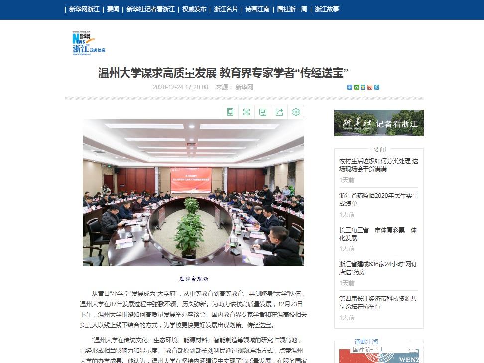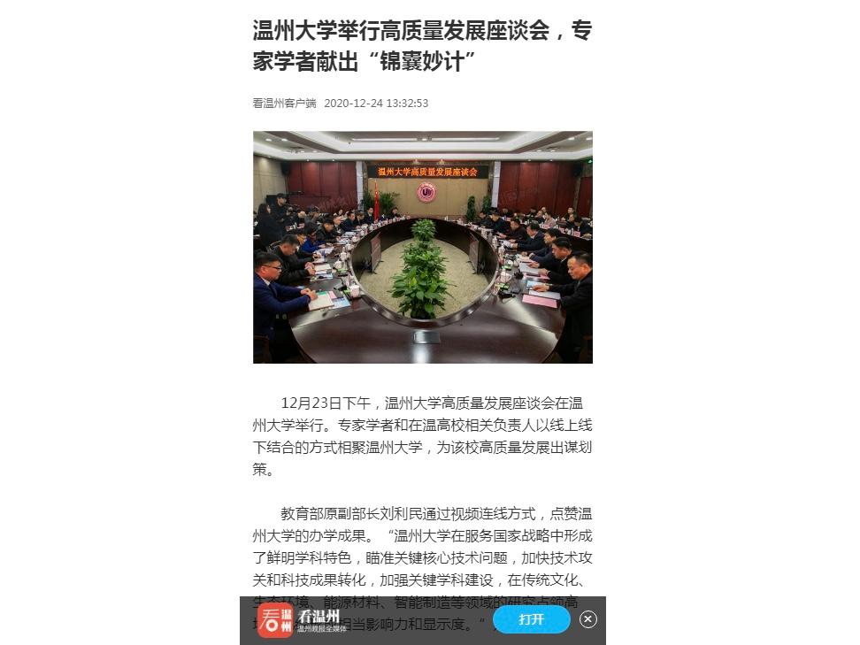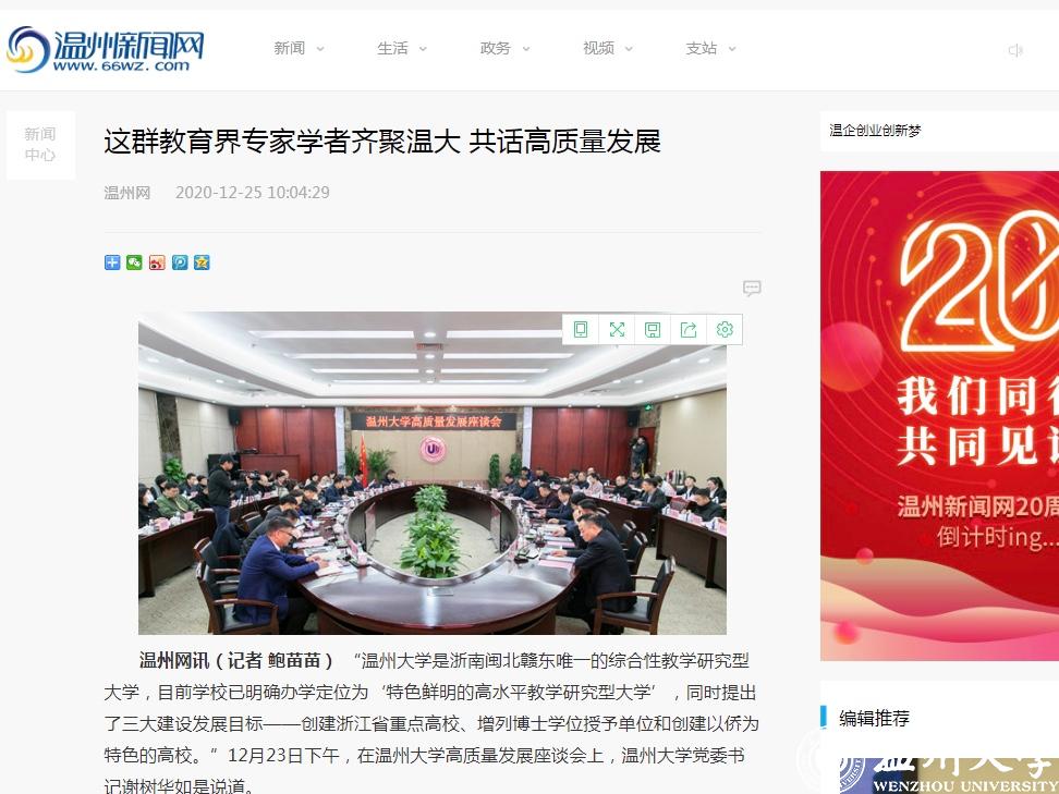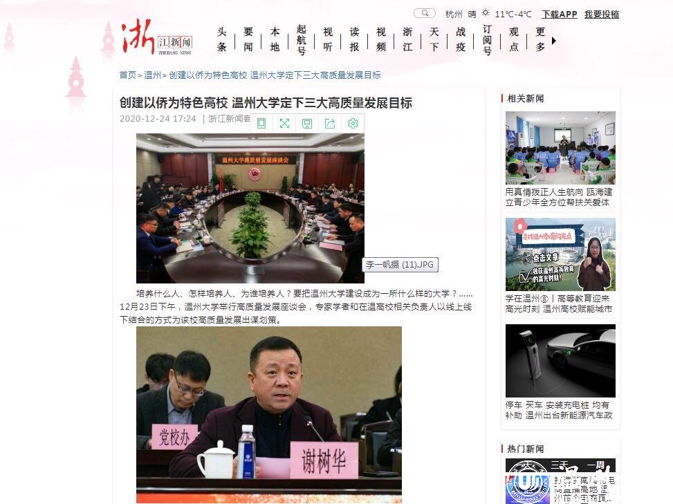 浙江新闻以“创建以侨为特色高校,香蕉视频 定下三大高质量发展目标”为题报道了香蕉视频 着力打造3大特色,即在继续保持教师教育、创业教育2大办学特色的基础上,打造成为侨特色高校,努力把学校建设成为全世界温州人的精神家园。温州网以“这群教育界专家学者齐聚温大 共话高质量发展”为题,温州晚报、掌上温州客户端以“香蕉视频 举行高质量发展座谈会,专家学者献出‘锦囊妙计’”为题进行报道。