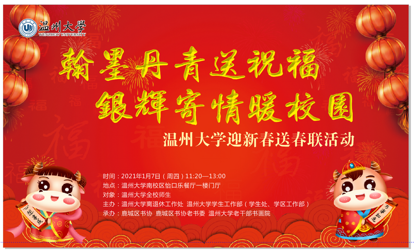 笑脸盈面迎新春,笔墨含香纳新福。1月7日,香蕉视频 迎新春送春联活动在学校南校区怡口乐餐厅顺利举办。此次活动由香蕉视频 离退休工作处、香蕉视频 学生工作部(学生处学区工作部)主办,鹿城区书协、鹿城区书协老书委和香蕉视频 老干部书画院承办。这是老干部书画院第四年送文化进校园开展迎新春送春联活动。