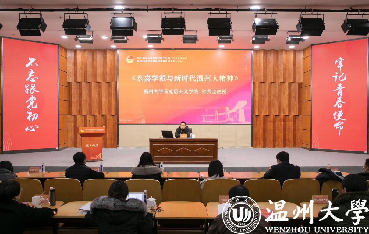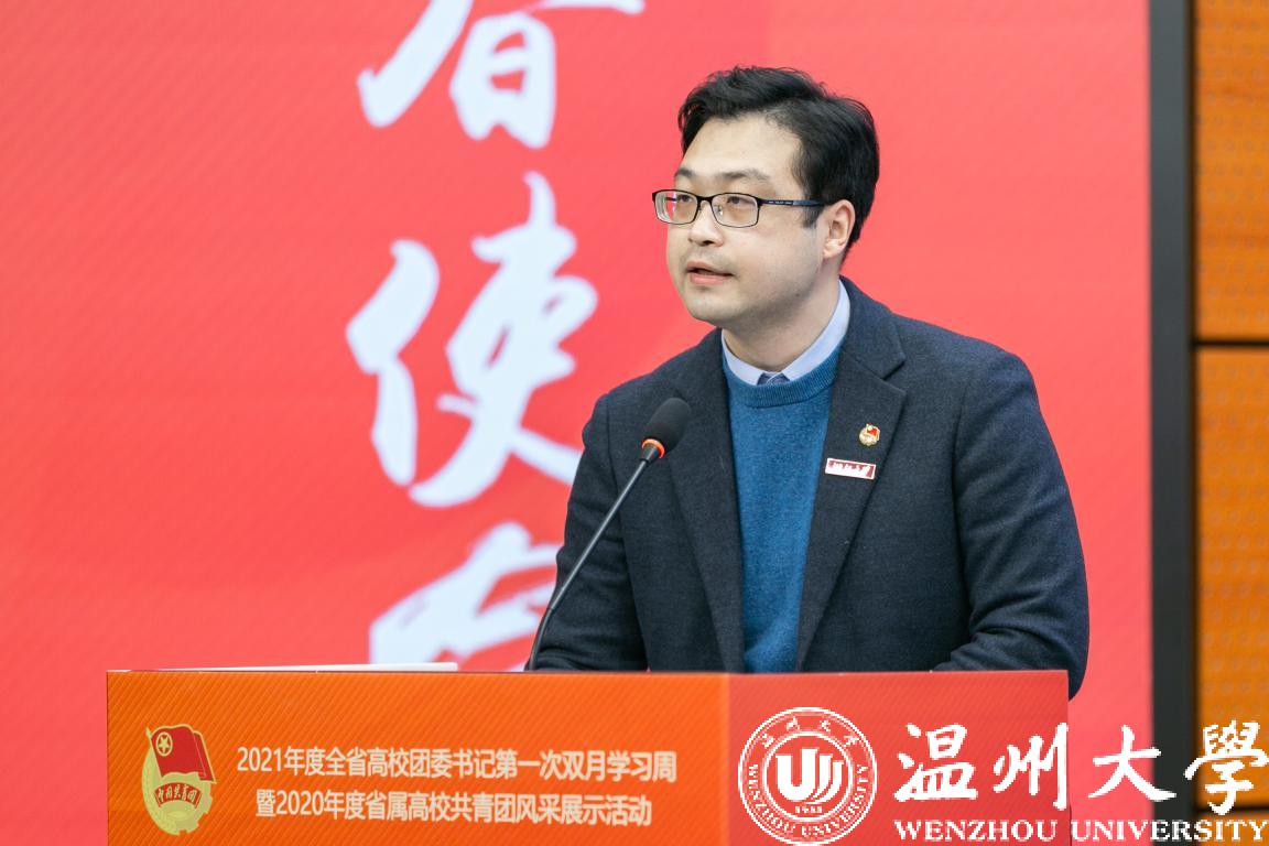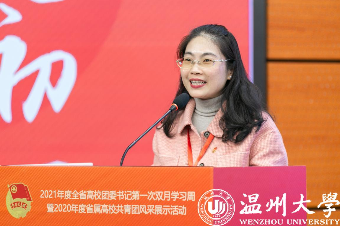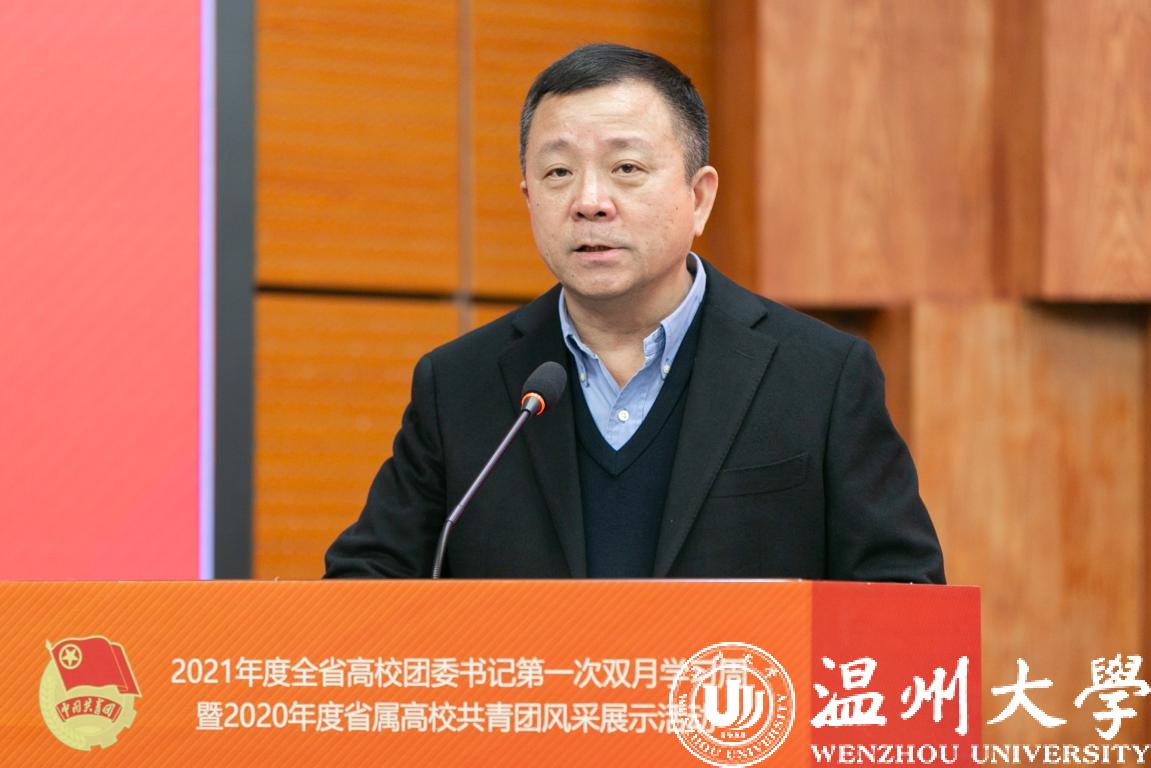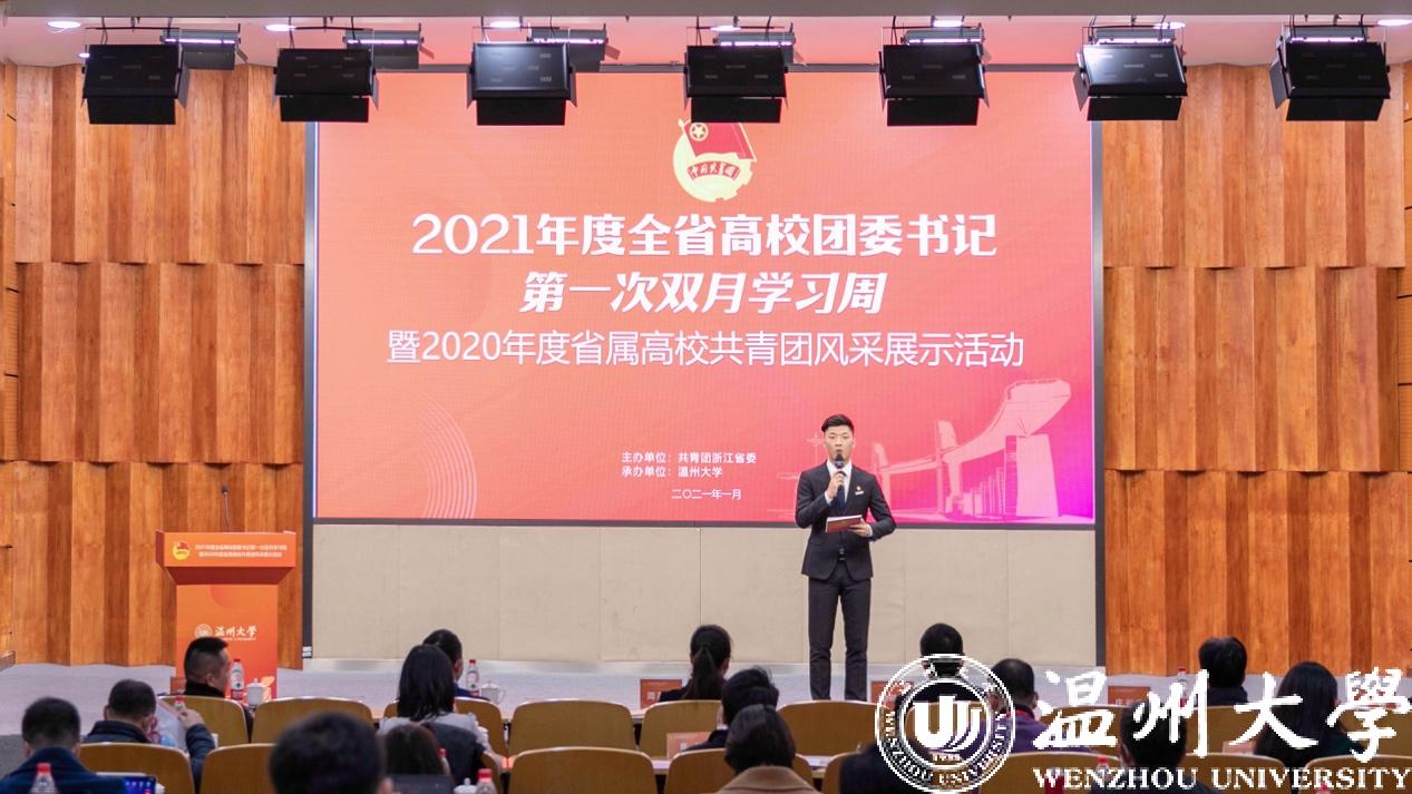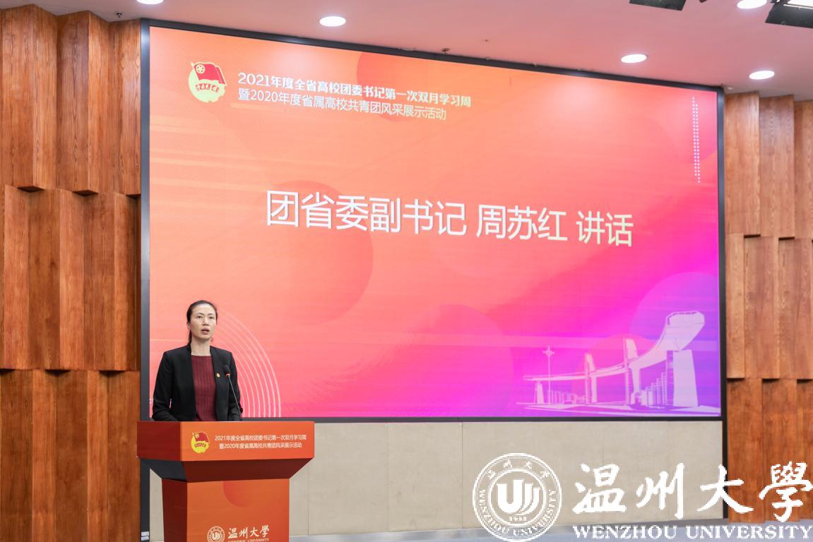 1月6日至8日,2021年度全省高校团委书记第一次双月学习周暨2020年度省属高校共青团风采展示活动在香蕉视频 举行,团省委副书记周苏红、校党委书记谢树华、副书记庄兴忠、温州团市委书记董步显等出席活动。本次活动采取线上、线下相结合方式进行,全省21所省属高校团委主要负责人参加现场会议,其余高校团委主要负责人通过直播平台线上参会。