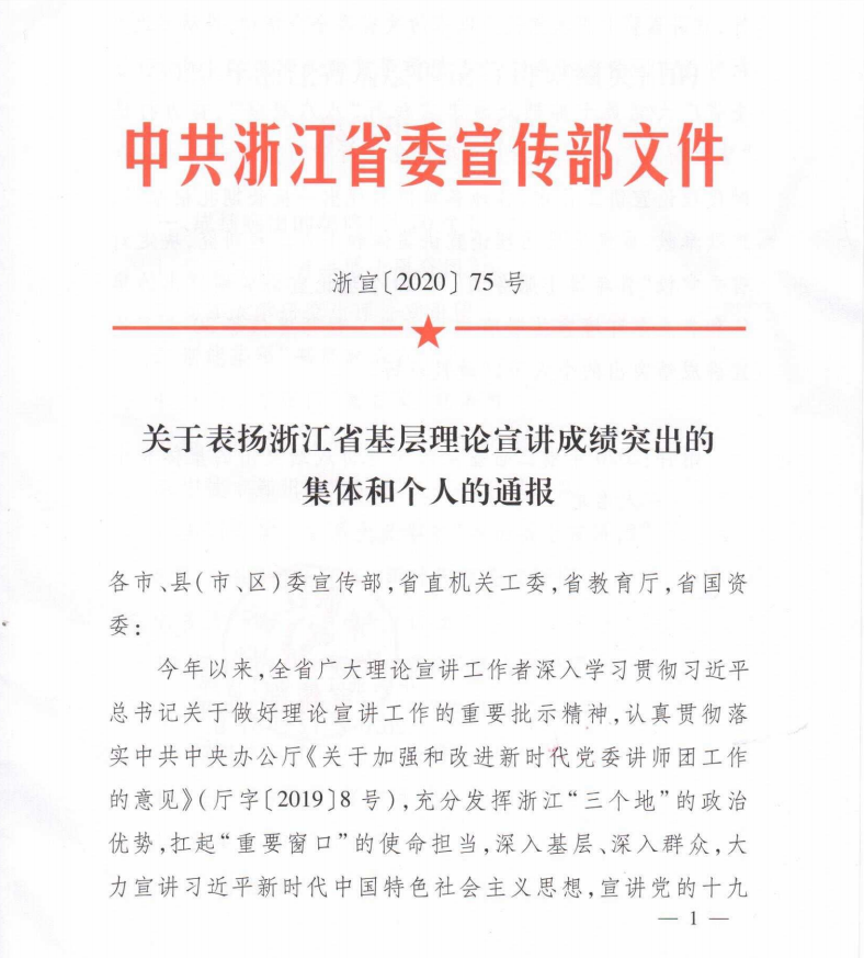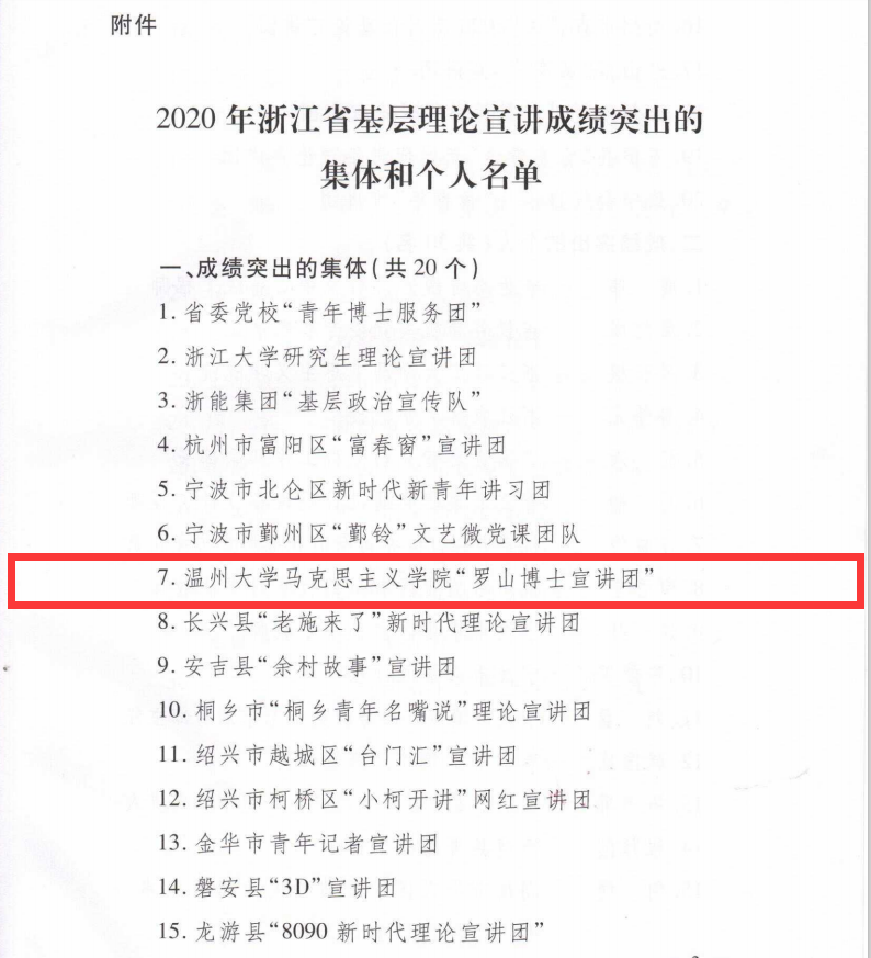 近日,从省委宣传部获悉,香蕉视频 马克思主义学院“罗山博士宣讲团”荣获2020年浙江省基层理论宣讲成绩突出集体(浙宣2020 (75)号文件),全省高校仅浙江大学和香蕉视频 获奖。