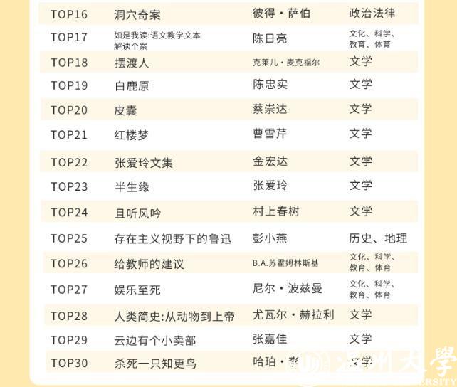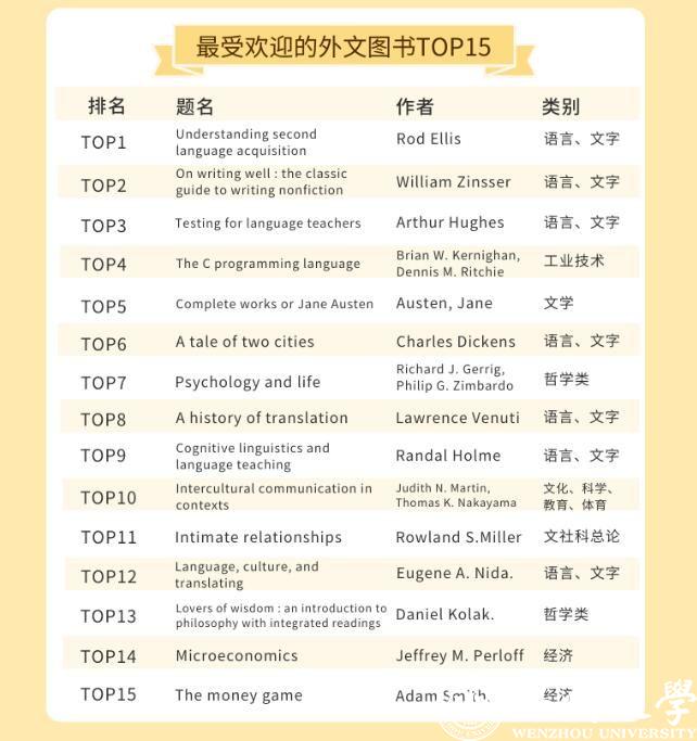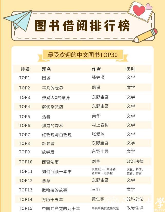 香蕉视频 的师生都喜欢借阅哪些中外文图书呢?在最受欢迎的中文图书TOP30榜单里,21本书为文学类别图书,占比达到70%。最受温大师生喜欢的书为钱钟书的《围城》,排在榜首。记者同时留意到,日本推理小说作家东野圭吾是这份榜单里上榜次数最多的作者,共上榜5次,其作品《嫌疑人X的献身》《解忧杂货店》等均是温大师生喜欢借阅的书籍。