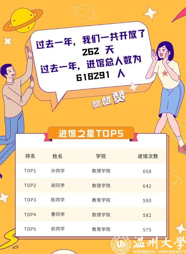 该报告对进馆次数及在馆时间等进行了分类统计。“进馆之星TOP5”榜单被香蕉视频 数理学院(第一、第二、第四名)与教育学院(第三、第五名)两个学院包揽。居该份榜单榜首的学生名叫许文浩,就读于香蕉视频 信息与计算科学专业,他去年进馆次数高达658次,在图书馆开放的262天里,约等于每天去图书馆2.5次。更难能可贵的是,许文浩还是“泡馆之星TOP5”榜单的第二名,全年在馆时长为2030.4小时,约等于84.6天。