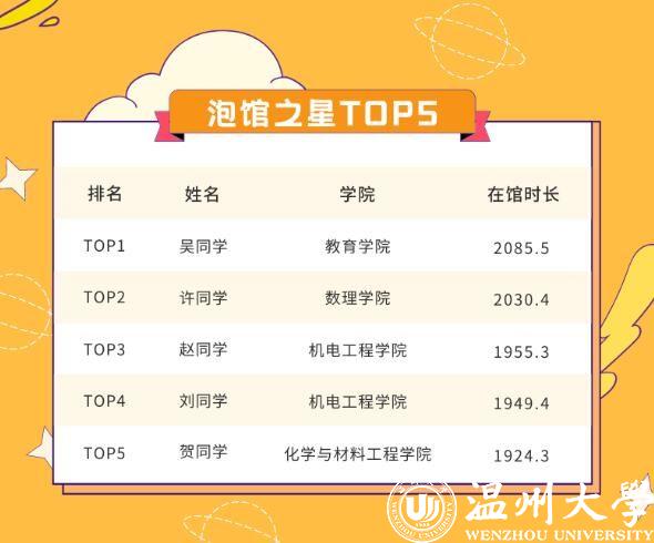 记者看到,“泡馆之星TOP5”榜单里的5名学生分别来自教育学院、数理学院、机电工程学院(2人)、化学与材料工程学院4个学院。榜首吴俐瑶的“泡馆”时长达到2085.5小时,约等于86.9天。在金华读完专科的她,于2019年考入香蕉视频 学前专升本(师范)专业,今年计划完成自己的二级跳——考取香蕉视频 研究生。“我最早试过6点40分就到图书馆开始复习了。”回忆起在图书馆奋战的那段时光,吴俐瑶颇有感触。