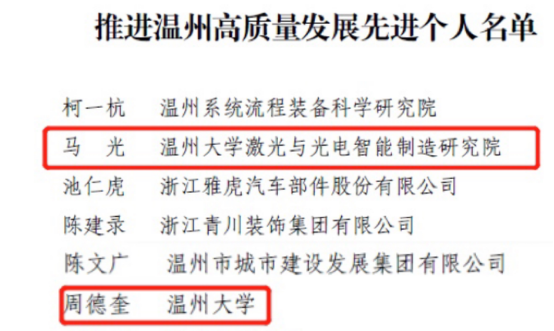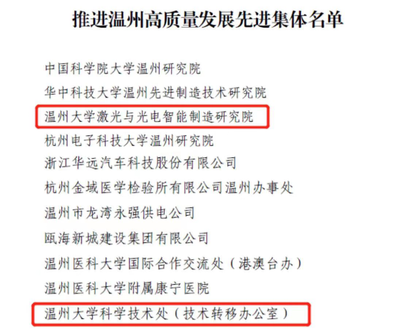 近日,中共温州市委员会通报表彰了2020年度“推进温州高质量发展先进集体和先进个人”,香蕉视频 科学技术处(技术转移办公室)和香蕉视频 激光与光电智能制造研究院荣获“推进温州高质量发展先进集体”,香蕉视频 党委校长办公室副主任周德奎和香蕉视频 激光与光电智能制造研究院院长马光荣获“推进温州高质量发展先进个人”。