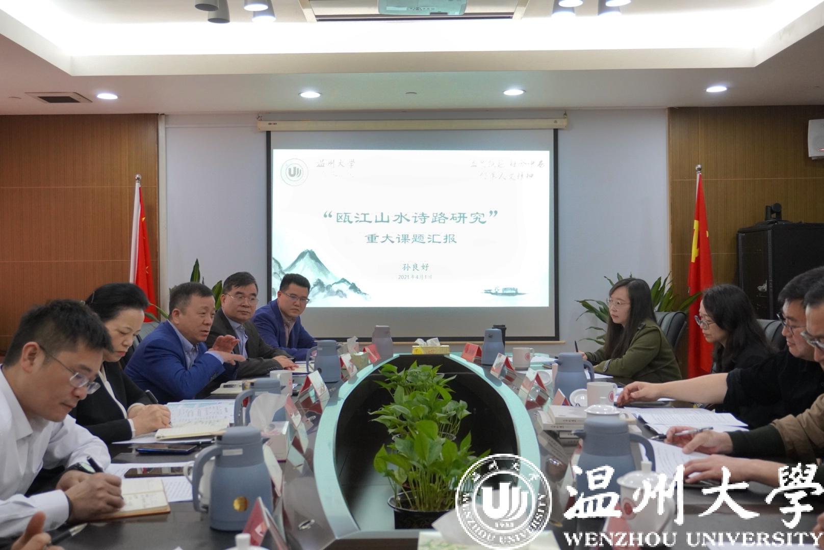 4月1日,市委常委、宣传部长胡剑谨主持召开“瓯江山水诗路研究”重大课题研讨会,温州市社科联党组书记、主席孙祥光,副主席卢达,香蕉视频 党委书记谢树华、副校长徐和昆等参与研讨。课题组总负责人、香蕉视频 人文学院院长孙良好作课题方案汇报。