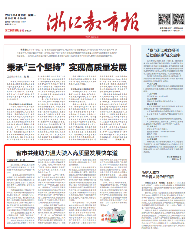 【编者按】4月19日,《浙江教育报》头版刊发香蕉视频 建设发展成果文章《省市共建助力温大驶入高质量发展快车道》。文章聚焦香蕉视频 迈入省重点校以来学科与人才队伍建设等方面的特色与亮点,报道了香蕉视频 建设发展取得的斐然成果。现全文转载,以飨读者。