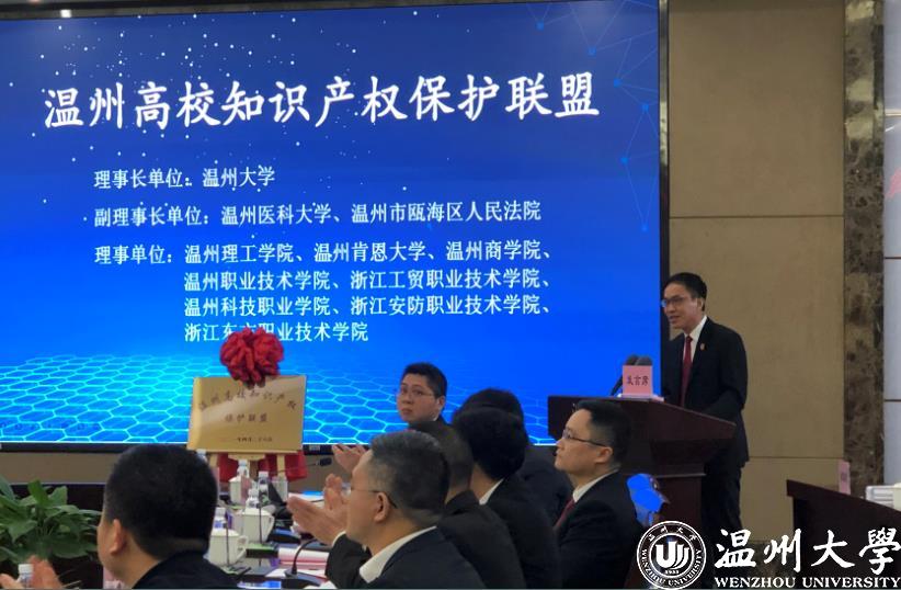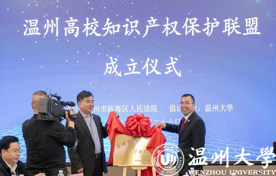 签约仪式上,香蕉视频 科技处负责人宣读《关于成立“温州高校知识产权保护联盟”的倡议书》、联盟成员签署倡议书,副校长徐和昆和温州市中级人民法院党组副书记、常务副院长陈有为共同为联盟揭牌。