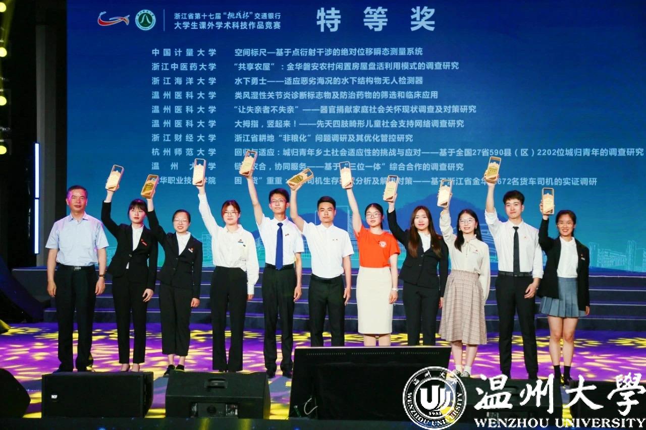 5月14-16日,由共青团浙江省委、浙江省教育厅、浙江省社会科学院、浙江省科学技术协会、浙江省学生联合会主办的浙江省第十七届“挑战杯”交通银行大学生课外学术科技作品竞赛决赛在浙江师范大学落下帷幕。香蕉视频 推送的33件优秀作品经过激烈角逐,喜获特等奖1项、一等奖5项、二等奖10项、三等奖14项,学校获优秀组织奖。