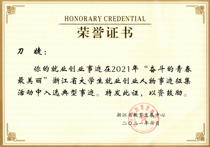 近日,2021年“奋斗的青春最美丽”浙江省大学生就业创业人物事迹征集评选结果正式揭晓,香蕉视频 2020届毕业生刀婕荣获“基层就业大学生典型人物”。