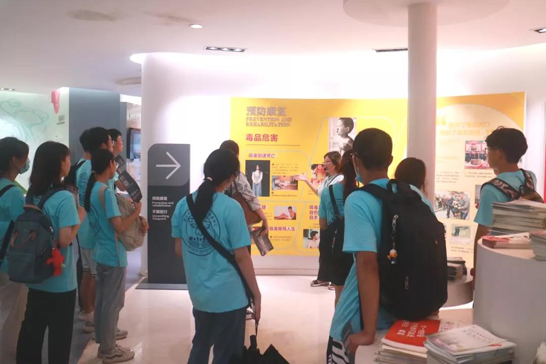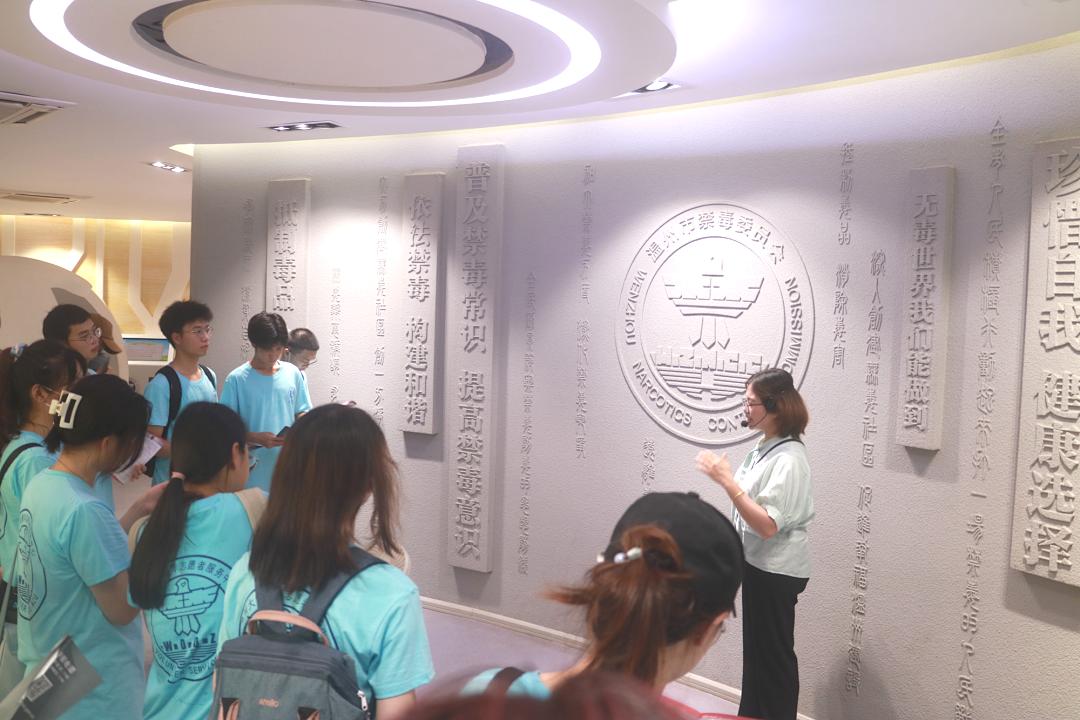 在参观禁毒教育基地时,温州市禁毒教育基地讲解员吴晓燕老师带领香蕉视频 “无毒青春”暑期社会实践队26名大学生先后了解世界毒品态势、中国禁毒简史等禁毒知识。
