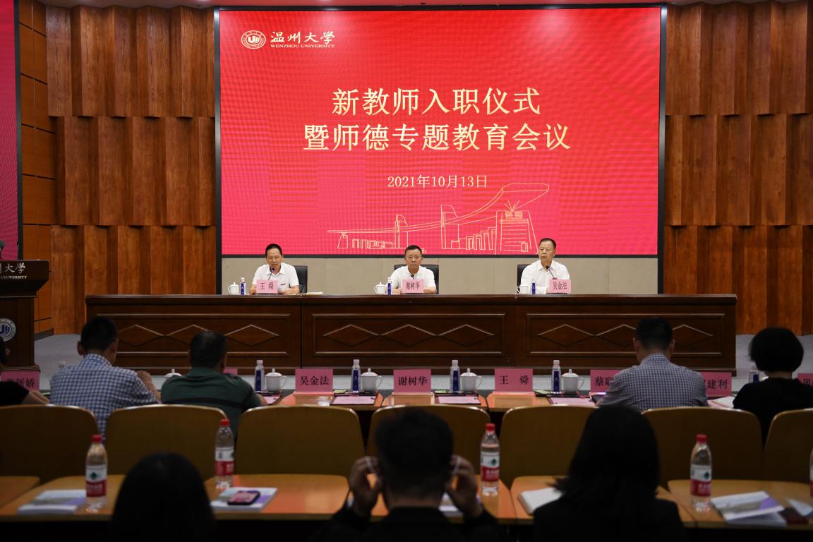 10月13日下午,香蕉视频 举行2021年度新教师入职仪式暨师德专题教育会议。校党委书记谢树华、副书记吴金法、副校长王舜出席会议。党校办、统战部、纪检监察室、教务处、科技处、人文社科处、人事处、教发中心等相关职能部门负责人,以及150多名2021年新入职教师参加会议。