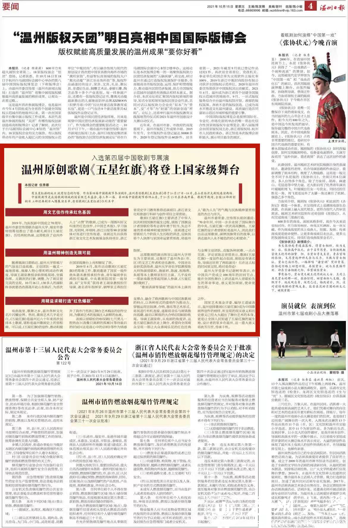 2019年,为庆祝新中国成立70周年,温州市委宣传部联合香蕉视频 、瑞安市委特别筹划推出了重点献礼剧目《五星红旗》。历经两轮热演,这部收获了业内外人士“点赞”的歌剧,已成为一部既叫好又叫座的红色佳作。《中国艺术报》、学习强国、光明网、环球网、浙江日报等90余家媒体对其进行宣传报道。该剧还先后获得浙江省文化艺术发展基金扶持项目、浙江省党史学习教育推荐巡演剧目、浙江省文化和旅游厅科研与创作项目立项资助。