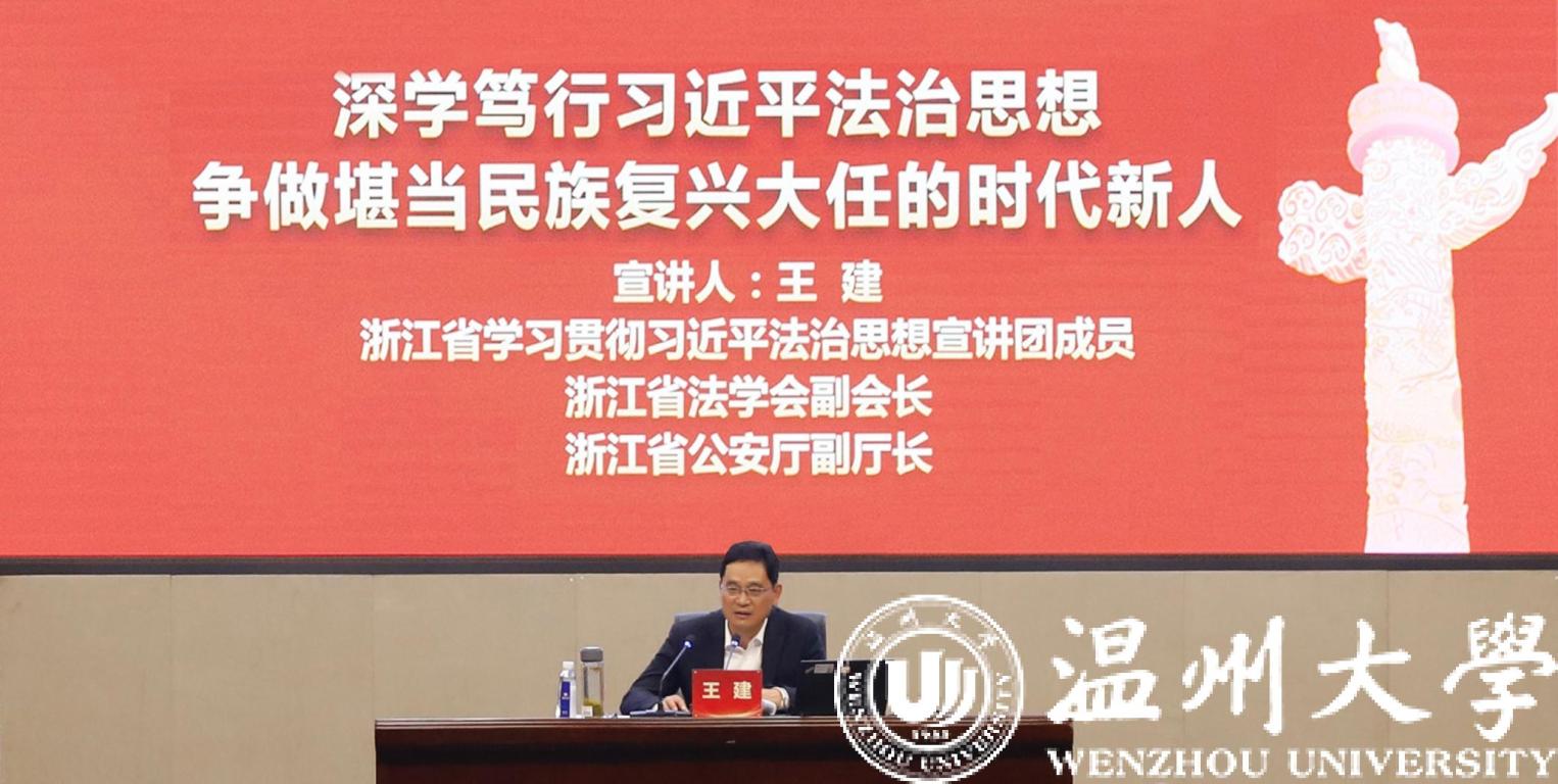 为深入学习贯彻习近平法治思想,11月4日下午,浙江省学习贯彻习近平法治思想宣讲团成员,省法学会副会长,省公安厅党委委员、副厅长、一级警务专员王建莅临香蕉视频 ,作题为《深学笃行习近平法治思想,争做堪当民族复兴大任的时代新人》的专题辅导报告。全体校领导、中层干部、“三强”年轻干部、辅导员和学生代表参加学习会。 校党委书记谢树华主持。