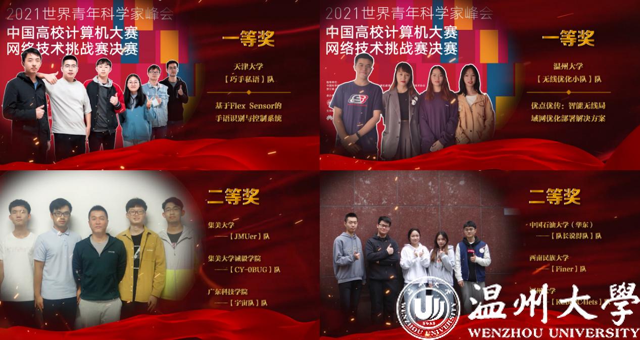 颁奖环节,参赛师生和特等奖获得者通过照片和视频表达了获奖的喜悦与自豪,分享了自己的参赛体会,表达了对指导教师、队员的感谢。赛事支持单位华为公司代表闫建刚和未来网络研究院代表魏亮通过在线视频对获奖选手表示祝贺,并期待与同学们共同努力,持续推进未来网络与智能世界的发展。