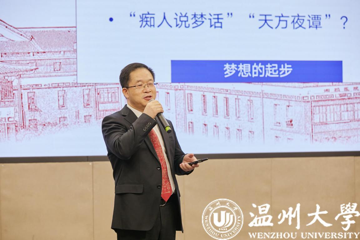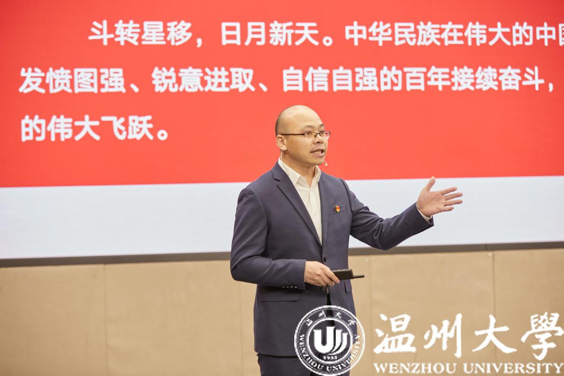 思政公开课在庄严的国歌声中拉开了序幕,校党委书记谢树华致辞。谢树华感谢市委宣传部创新搭建全市高校“思政公开课”平台,让广大青年学子有缘线上线下相聚在美丽的香蕉视频 ,共学思政大课、共悟时代思想、共话美好未来。谢树华指出,香蕉视频 历来高度重视大学生思政教育工作,具有思政教育的优良传统和丰硕成果,此次活动选择在香蕉视频 举办,既是对温大思政工作的一种肯定和支持,也是对温大的一种莫大鼓舞和巨大鞭策。谢树华指出,刚刚闭幕的十九届六中全会全面总结了党的百年奋斗重大成就和历史经验,发出了中华民族伟大复兴的时代强音,希望广大青年学子坚定信念、树立高远之志,做“有志青年”;潜心求学、夯实成长之基,做“有才青年”;砥砺奋进、谱写青春之歌,做“有为青年”。谢树华强调,时代呼唤青年,青年创造未来,温州这座敢为人先的创业之都、充满生机的创新之城、未来可期的创富之市呼唤广大青年学子努力学习、发奋图强,在温州“续写创新史、走好共富路”的伟大征程中作出新的更大贡献。
