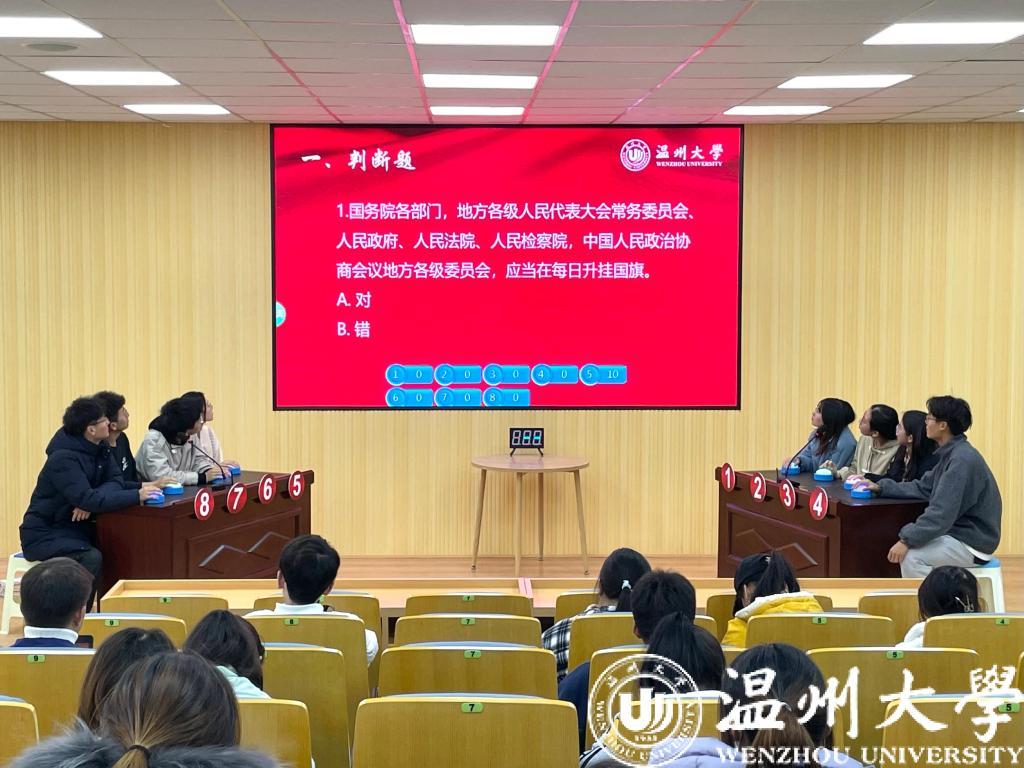 12月1日,“宪法宣传周”系列活动之“习近平法治思想”知识竞赛香蕉视频 举行。知识竞赛重点围绕习近平法治思想相关内容,设有判断题、单选题、多选题和逻辑题。700余名学生参与到知识竞赛初赛环节,最终24名选手进入决赛。决赛现场紧张热烈,答对得分、答错扣分的竞赛机制也为比赛增加了更大的悬念。知识竞赛充分检验了大学生对习近平法治思想、宪法知识的掌握程度,将法治学习的知识性与趣味性融为一体。